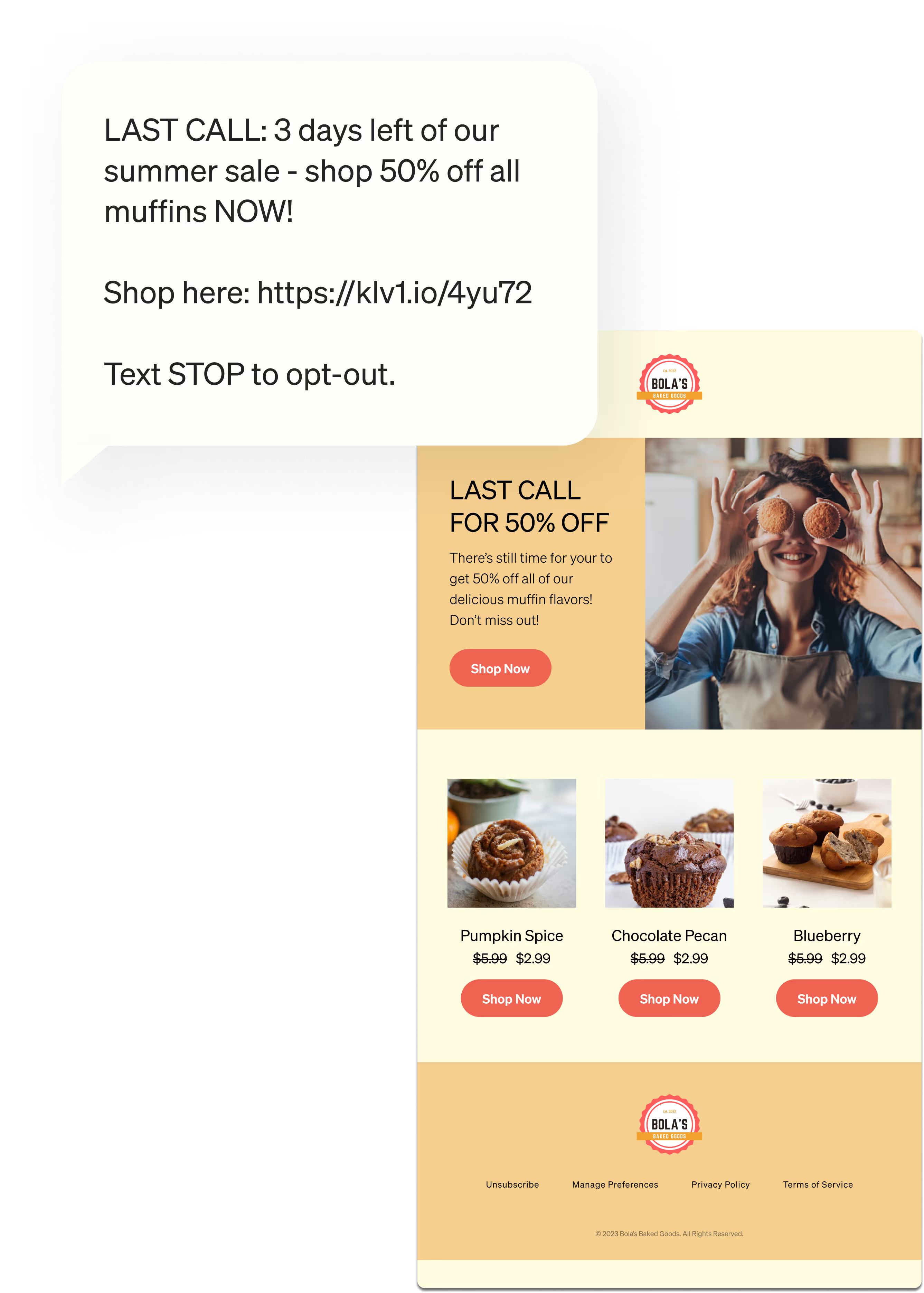 After you launch your promotion with SMS, follow up further in the promotion cycle with an email. Consider highlighting multiple products that are still on sale, and include clear call-to-actions to drive recipients to your site. Since you have more room for content in email, include details that weren’t captured in the SMS campaign.