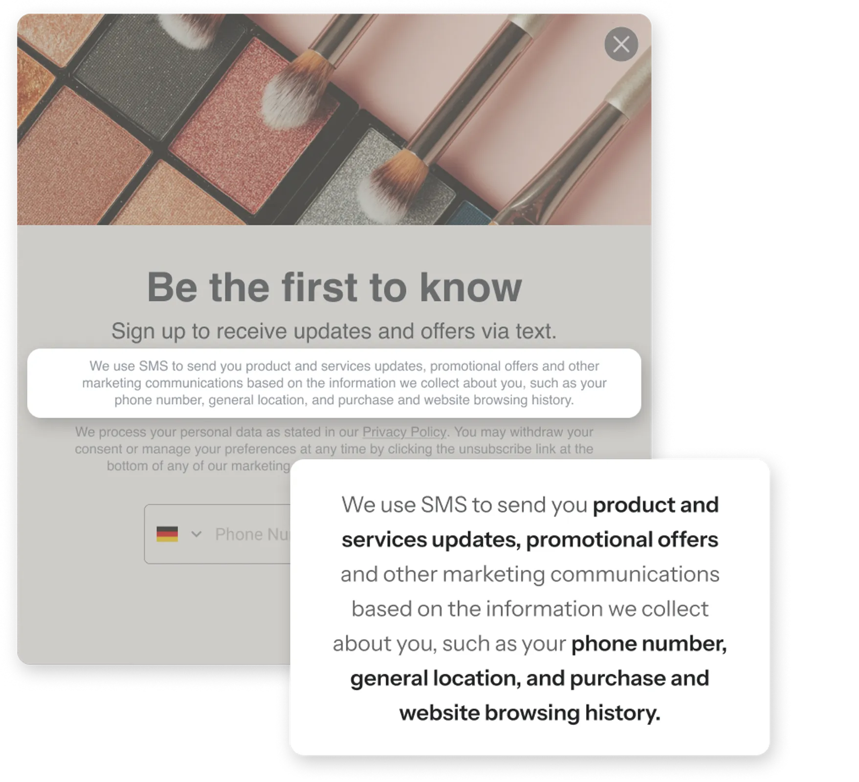 - Know what information to provide at opt-in. For example, GDPR (General Data Protection Regulation) requires informing EU (European Union) subscribers of how you'll use their data. If you’re planning to send subscribers product launches, promotions, and abandoned cart reminders, list those out in your sign-up form disclosure language.