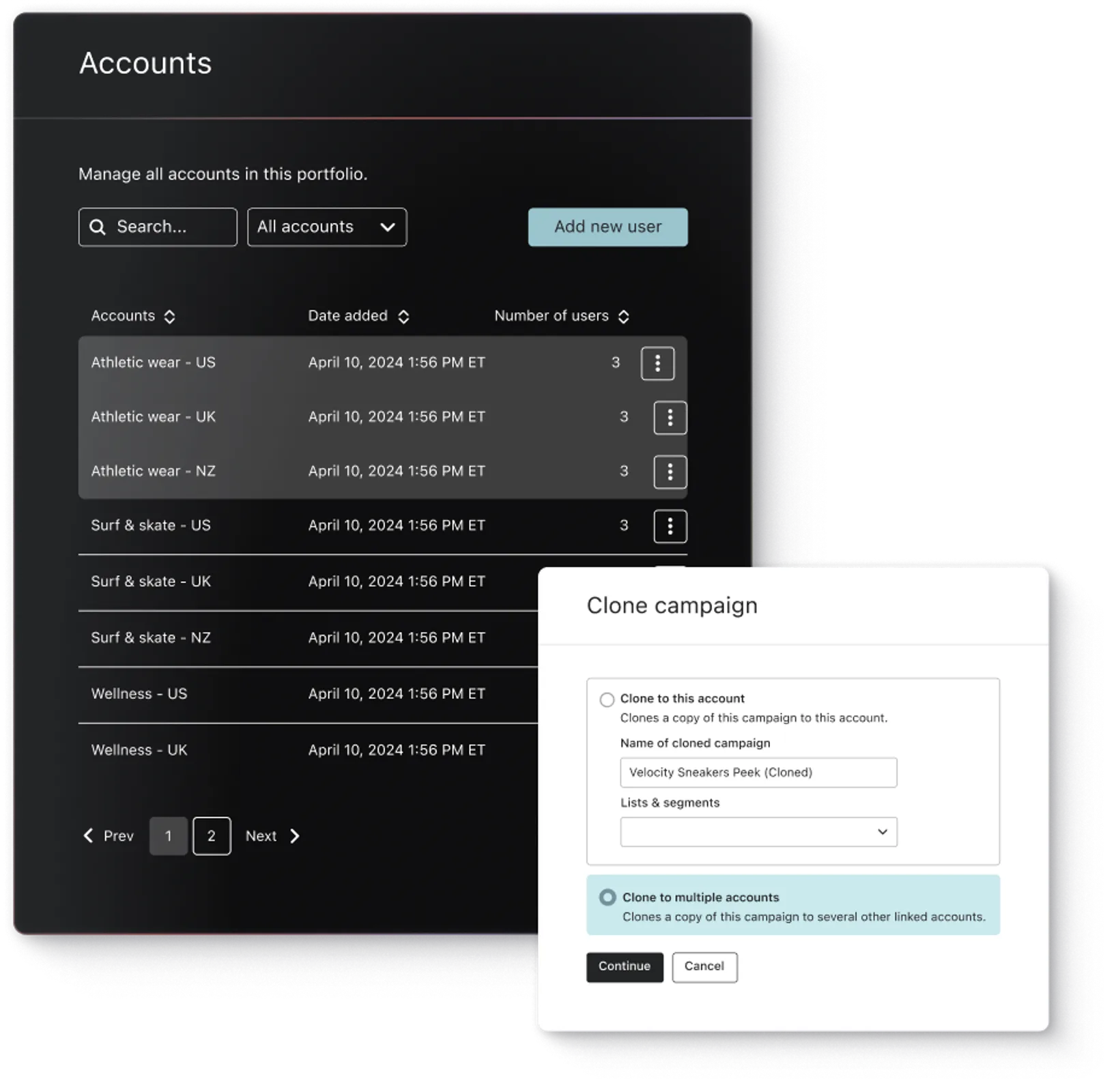 - Clone your assets across accounts: Have you built something in an account that you’re really proud of? You can now clone it to all your other accounts with just a few clicks. Learn how to save time by cloning forms, segments, campaigns, templates, and flows across your accounts.
