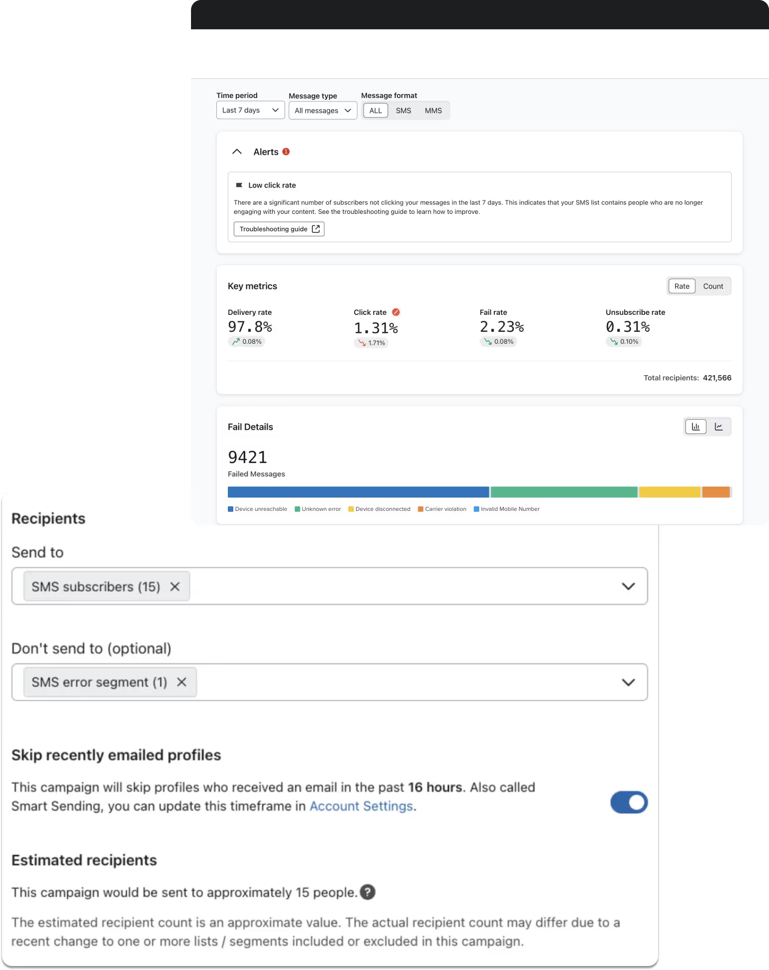 When you consistently send campaigns to phone numbers that return errors, you harm your overall deliverability. Analyze your failed message reasons and take the necessary steps to decrease these logs. A key proactive strategy is to create an error segment and exclude it from all of your text message campaigns to ensure that you’re only sending to those who can receive your texts.