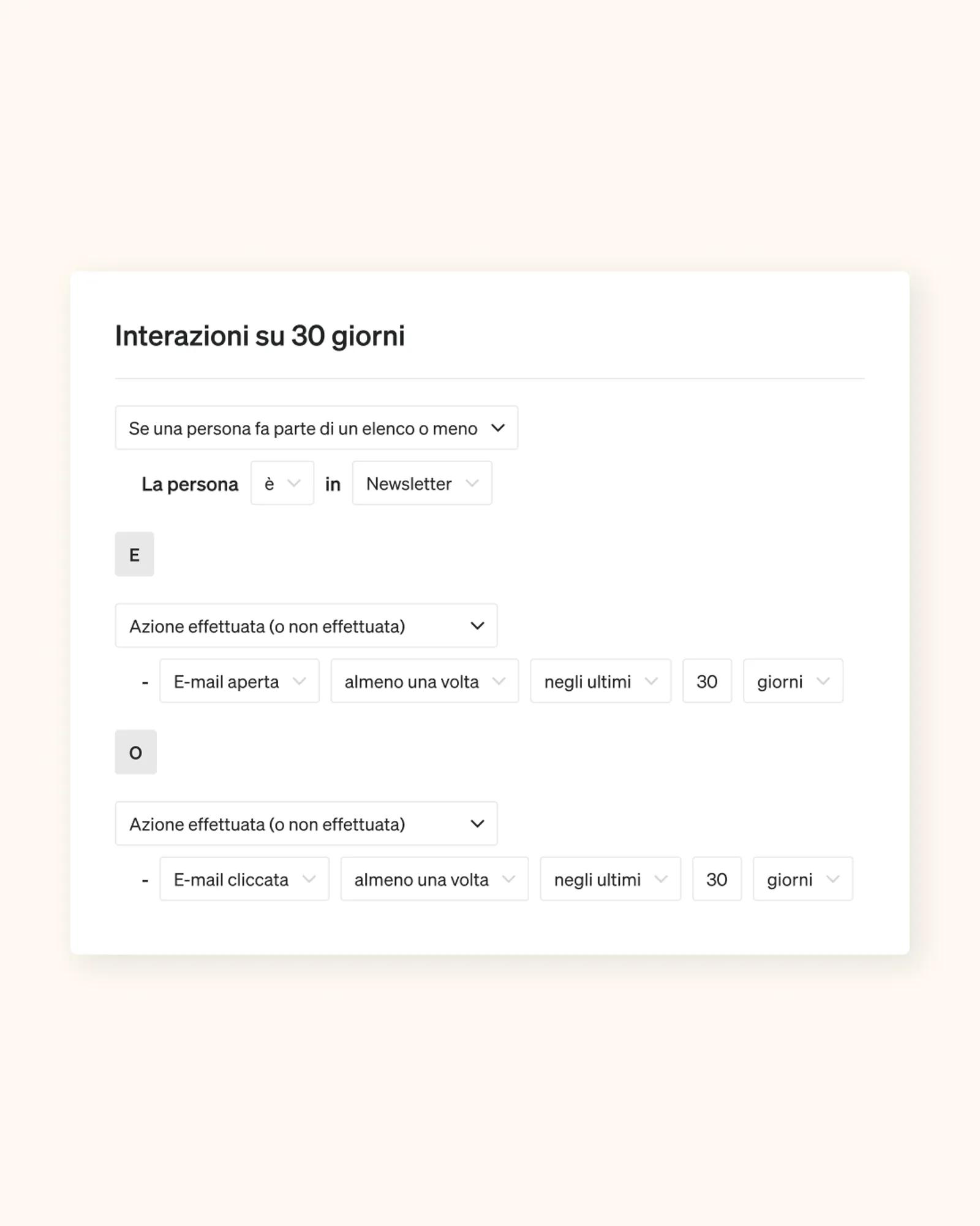 Ti consigliamo di inviare le e-mail seguendo sempre un programma di invio basato sul coinvolgimento degli utenti (engagement). Ciò significa che devi inviare comunicazioni più frequentemente al tuo segmento di clienti più coinvolto e aggiungere segmenti di utenti meno coinvolti solo in determinate occasioni, per evitare di bombardare di messaggi i destinatari.