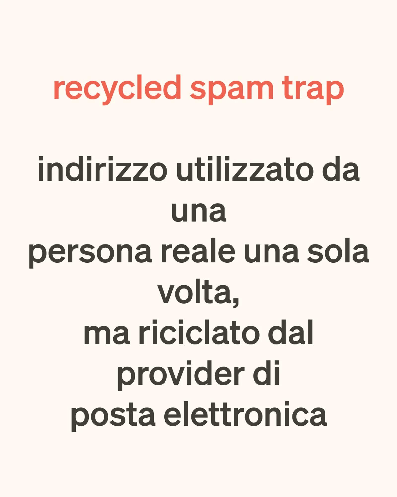 Una recycled spam trap è un indirizzo e-mail che è stato utilizzato da una persona reale in un determinato momento, ma che nel frattempo è stato abbandonato e trasformato in una trappola per lo spam dal provider di posta elettronica.