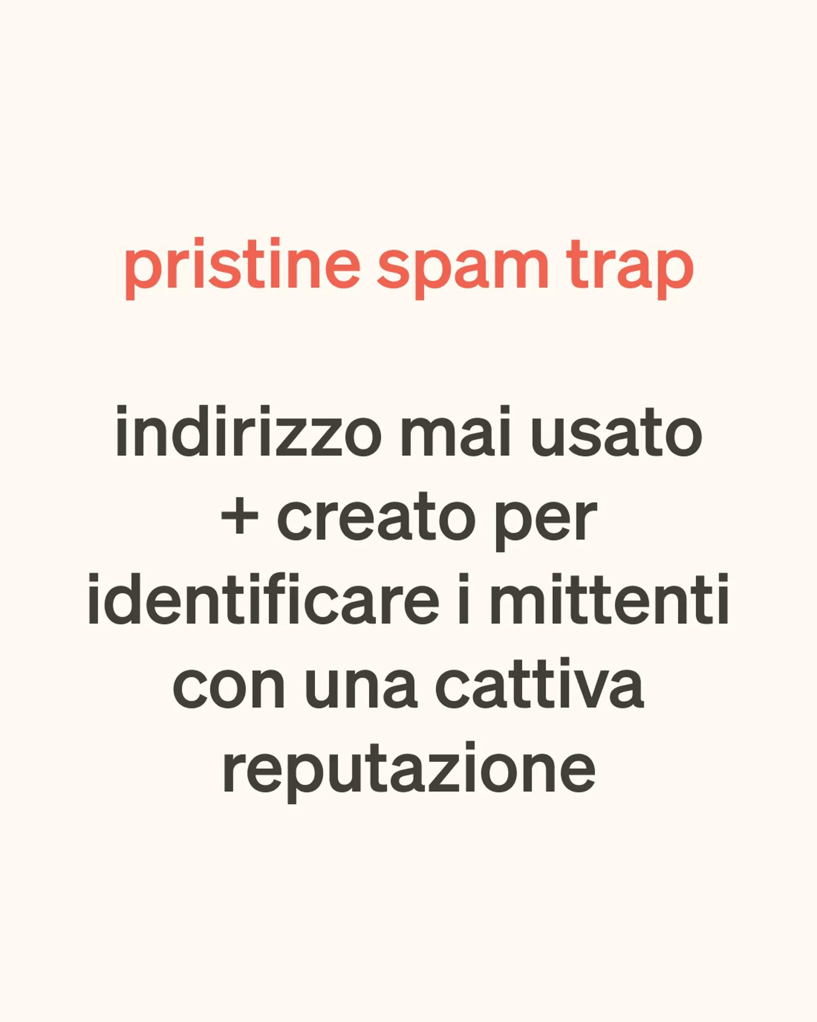 La pristine spam trap è un indirizzo e-mail che è stato pubblicato su un sito web pubblico, ma è nascosto in modo tale che un utente comune non riesce a trovarlo.