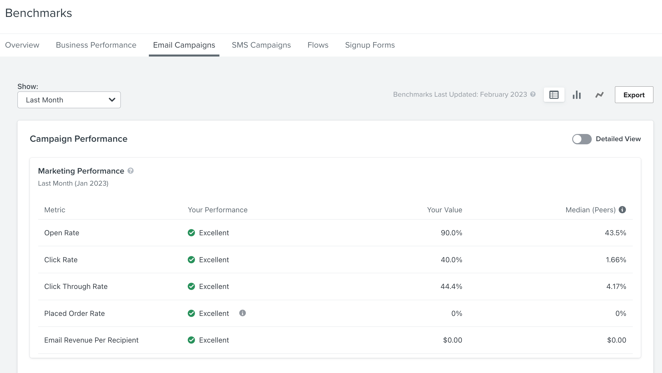 Benchmarks are a helpful way to measure how your messages are performing in relation to other businesses similar to yours. This tool will give you a sense of whether or not you are on par with your peers in your industry.