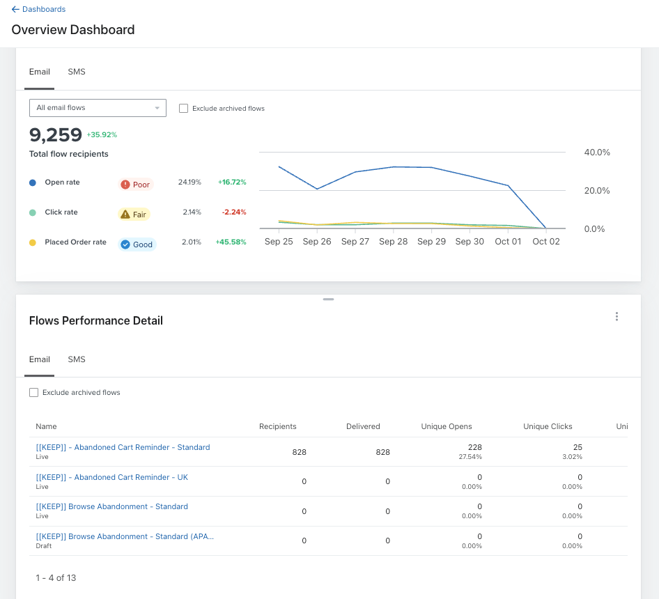 Here, you can assess whether or not you’re reaching your potential across key performance indicators. Look at aggregated performance as well diving into benchmarks for specific flows, like abandoned carts or welcome series. You want to prioritize improving anything marked 'Fair' or 'Poor.