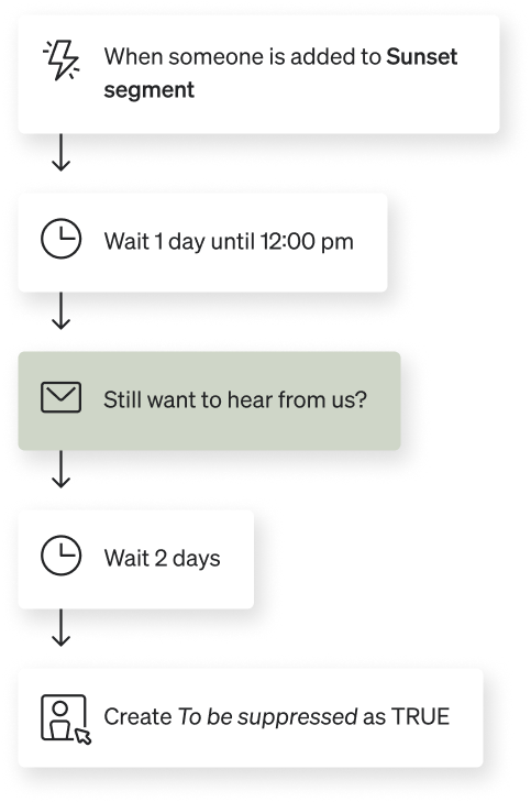 A sunset flow is the last step in the customer journey before you (potentially) remove someone from your list. This flow triggers when someone joins a segment of your least engaged subscribers (i.e. people who haven’t opened or clicked an email from you in a long time).