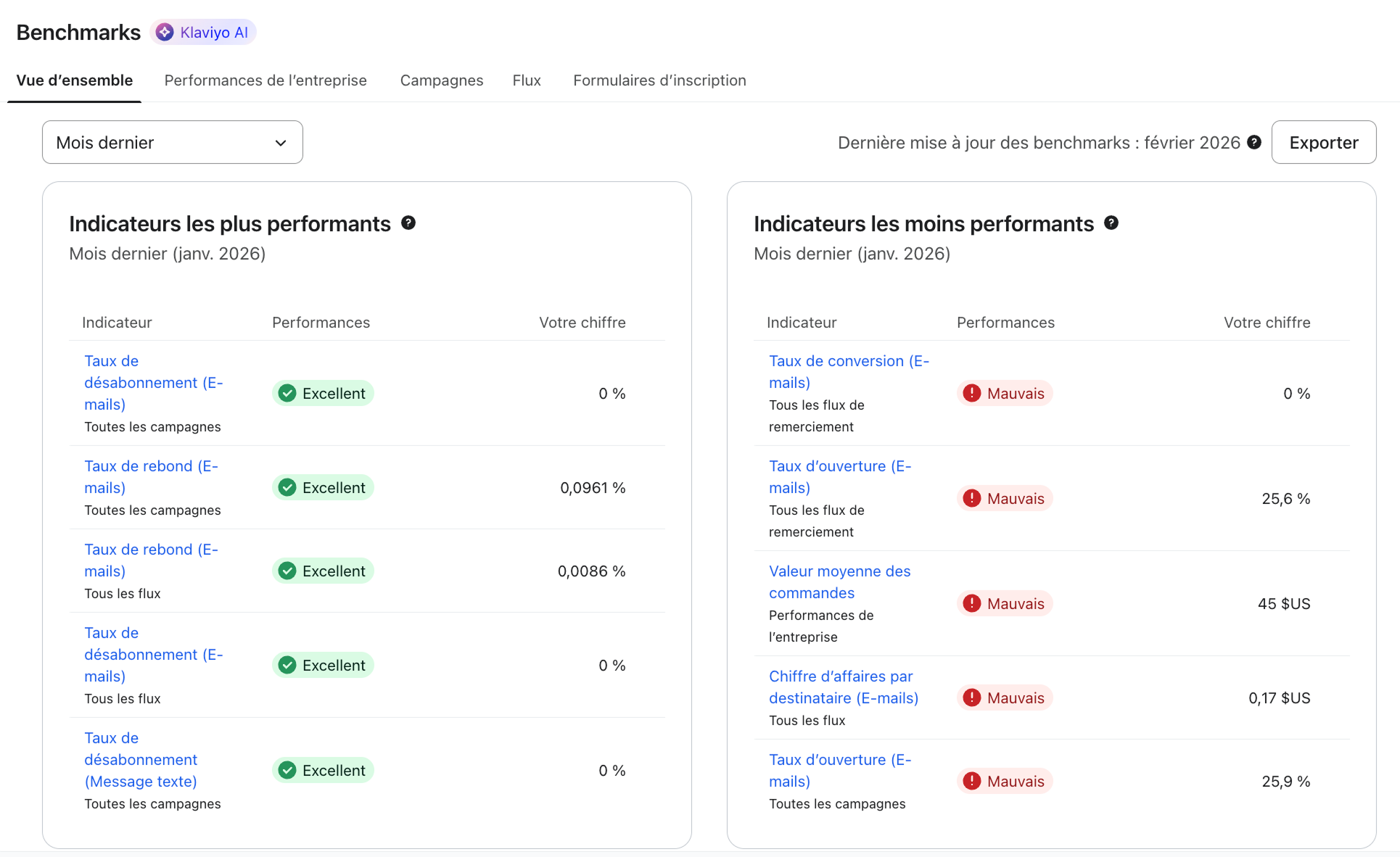 Klaviyo propose de nombreuses fonctionnalités pour consulter et analyser vos données. Apprenez quand et comment utiliser chaque outil pour évaluer vos performances, apporter des améliorations et développer votre chiffre d’affaires. Les outils ci-dessous permettent d’identifier des axes d’amélioration pour mieux suivre la situation de votre compte et améliorer vos performances marketing.