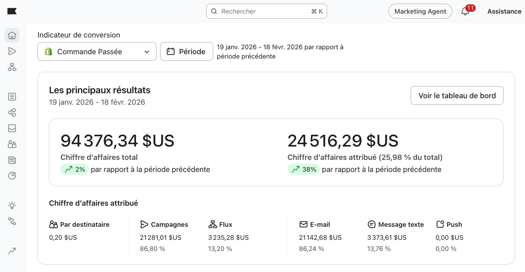 Les tableaux de bord vous donnent une visibilité complète sur vos performances marketing grâce à des cartes personnalisables qui mettent en évidence votre réussite pour chaque canal marketing (e-mails, SMS et notifications push).