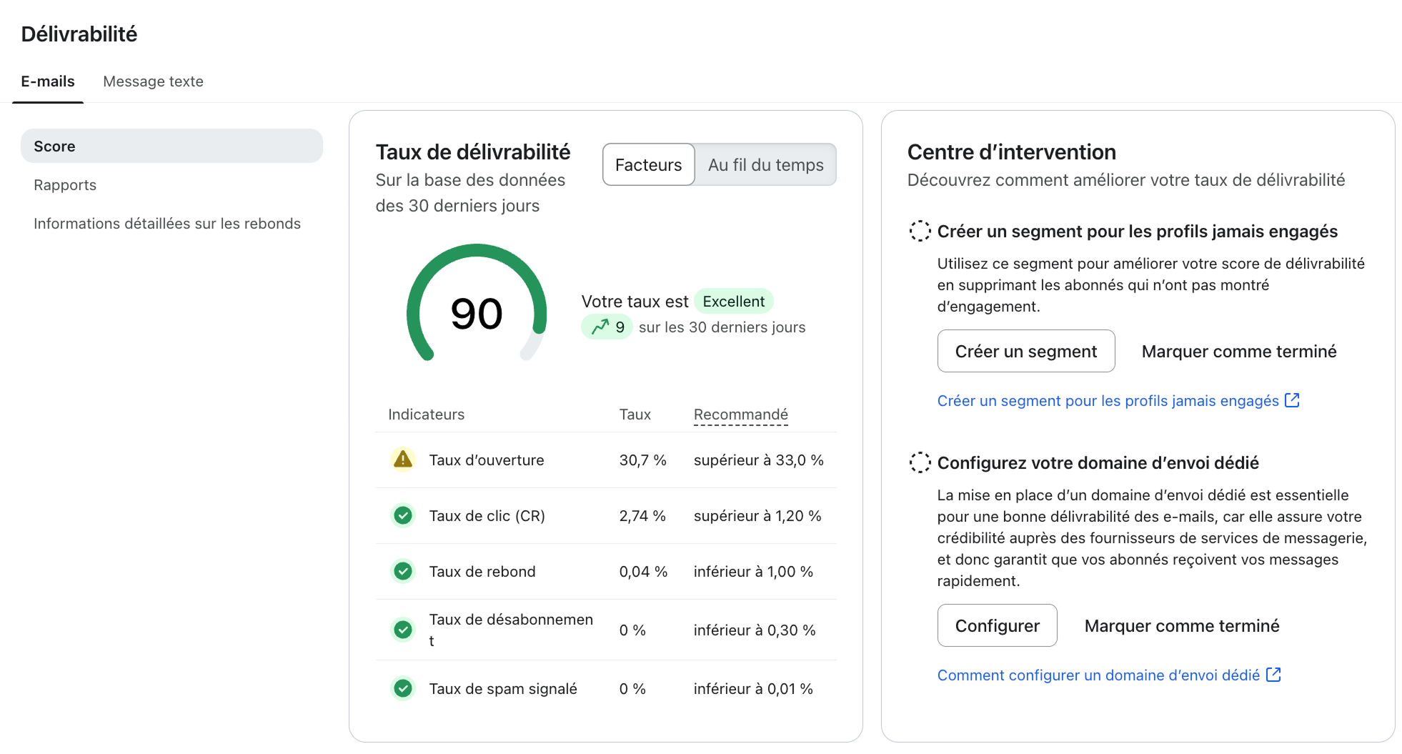 Le centre de délivrabilité vous permet de suivre facilement votre réputation d’expéditeur pour les e-mails et les SMS envoyés via Klaviyo.