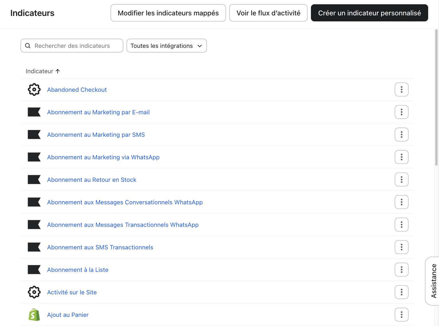 L’onglet « Indicateurs » fournit une liste de vos indicateurs spécifiques aux fonctionnalités que vous utilisez et aux intégrations dont vous disposez, par exemple Produit Vu. Consultez cet onglet pour assurer le suivi de ces indicateurs et vérifier que la synchronisation entre vos intégrations et Klaviyo fonctionne comme prévu.