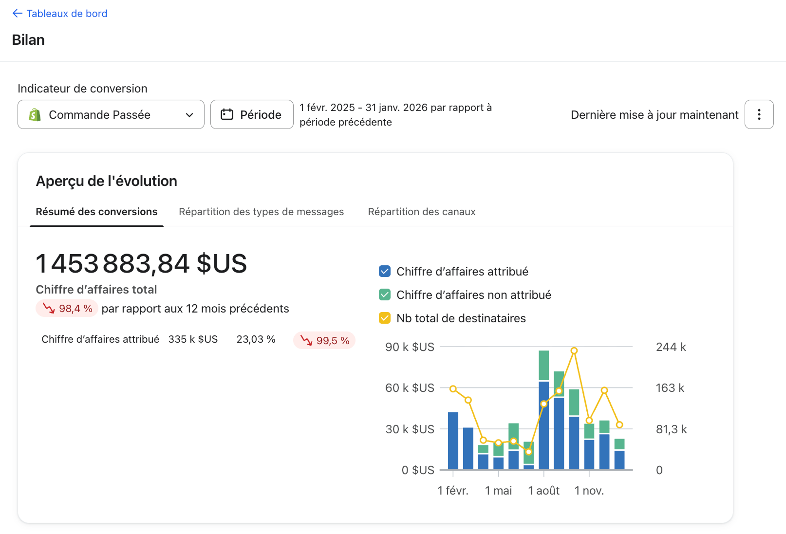 - Suivre les tendances de conversion sur une période spécifique grâce au tableau de bord de bilan préconçu.