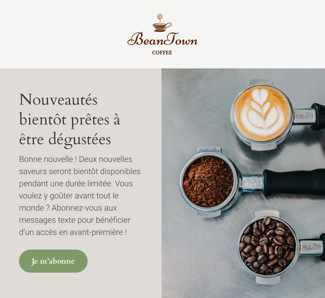 Comme le montre l’exemple ci-dessous, Beantown encourage ses abonnés aux e-mails à s’inscrire aux messages texte pour découvrir en exclusivité ses nouveaux cafés (le sentiment d’exclusivité leur donne une raison de s’inscrire). Comme les abonnés aux e-mails s’intéressent déjà à la marque, ils sont plus susceptibles de s’abonner aux messages texte que les nouveaux visiteurs sur le site web.