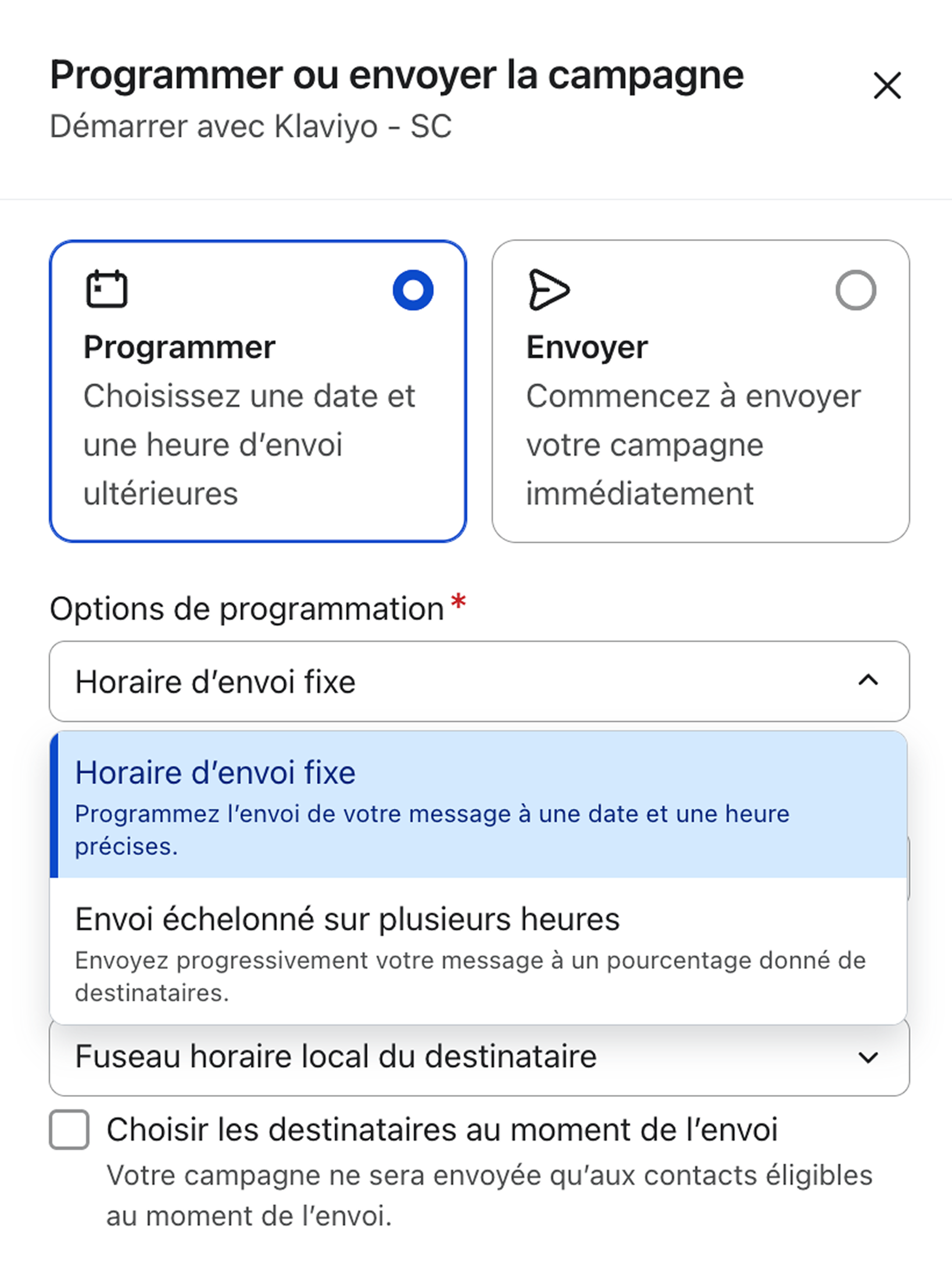 Dans Klaviyo, vous pouvez envoyer vos messages immédiatement ou sélectionner un horaire d’envoi. Lorsque vous programmez une campagne, vous pouvez choisir un horaire d’envoi fixe, échelonné ou utiliser la fonctionnalité Smart Send Time (horaire d’envoi intelligent).