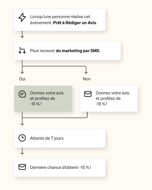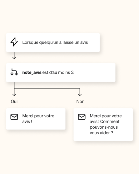 Ensuite, configurez un flux de suivi des avis pour remercier l’auteur de l’avis et honorer tout avantage promis. Ce flux vous aide à rester conforme à la réglementation, à offrir une assistance client adaptée aux avis qui le nécessitent (par ex. : avis de 1 à 3 étoiles) et à montrer à vos clients qu’ils sont appréciés grâce à un message de remerciement sincère.