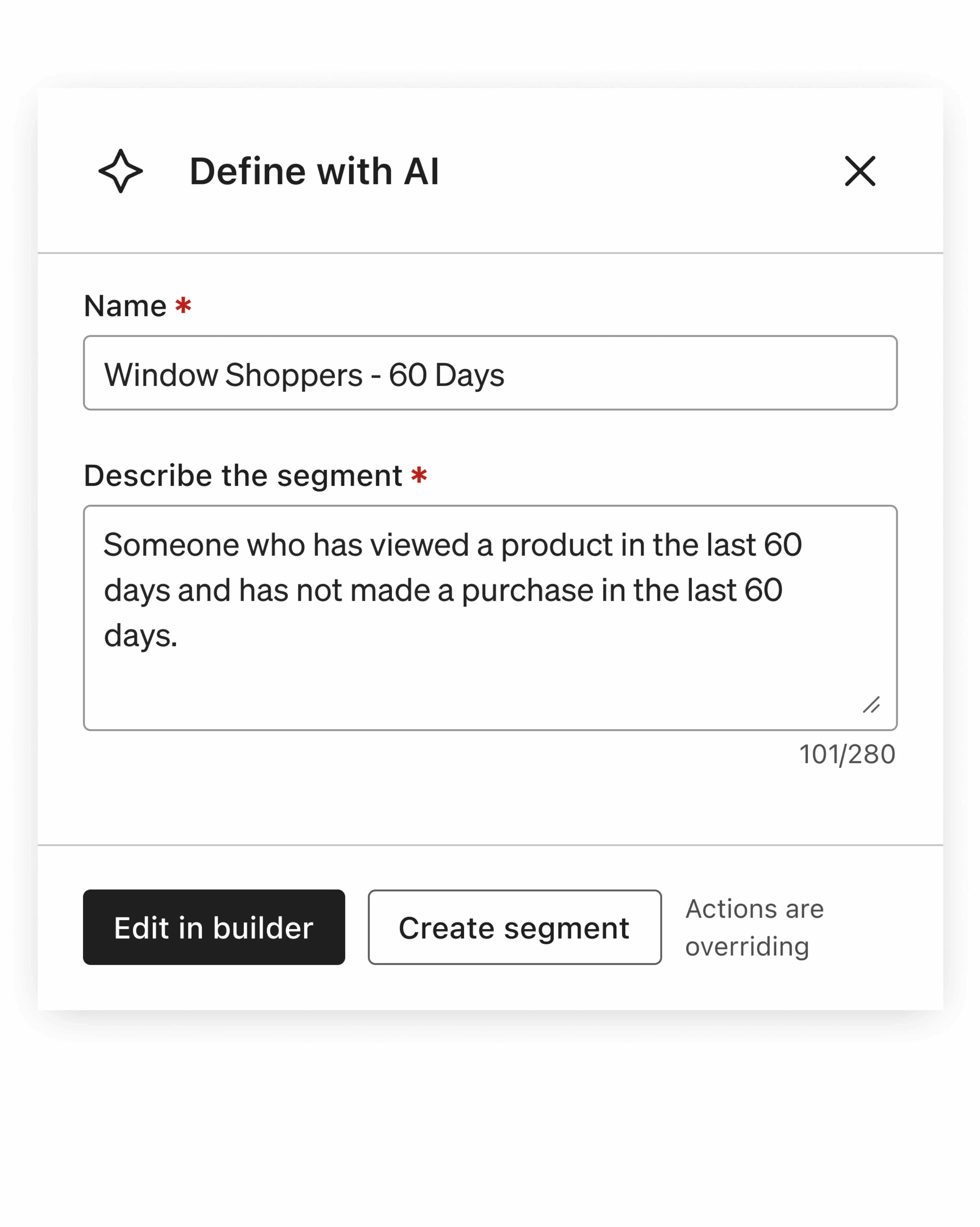 - Upon creating a new segment, click Define with AI instead of inputting conditions.