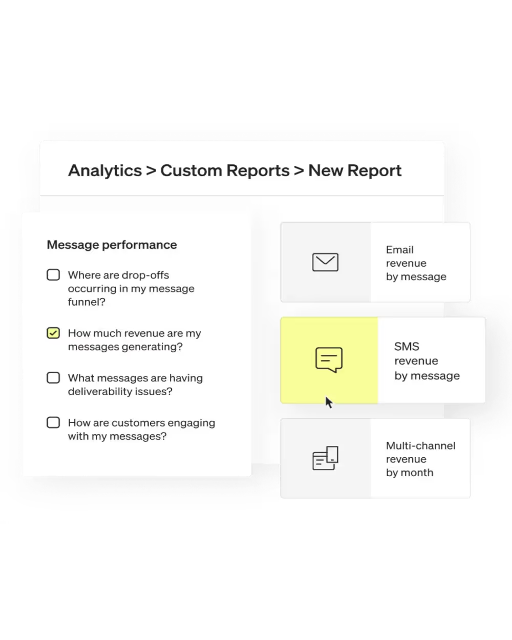 For instance, they keep a close eye on the Campaign performance summary card, filtering it by channel to see revenue growth and recipient count.