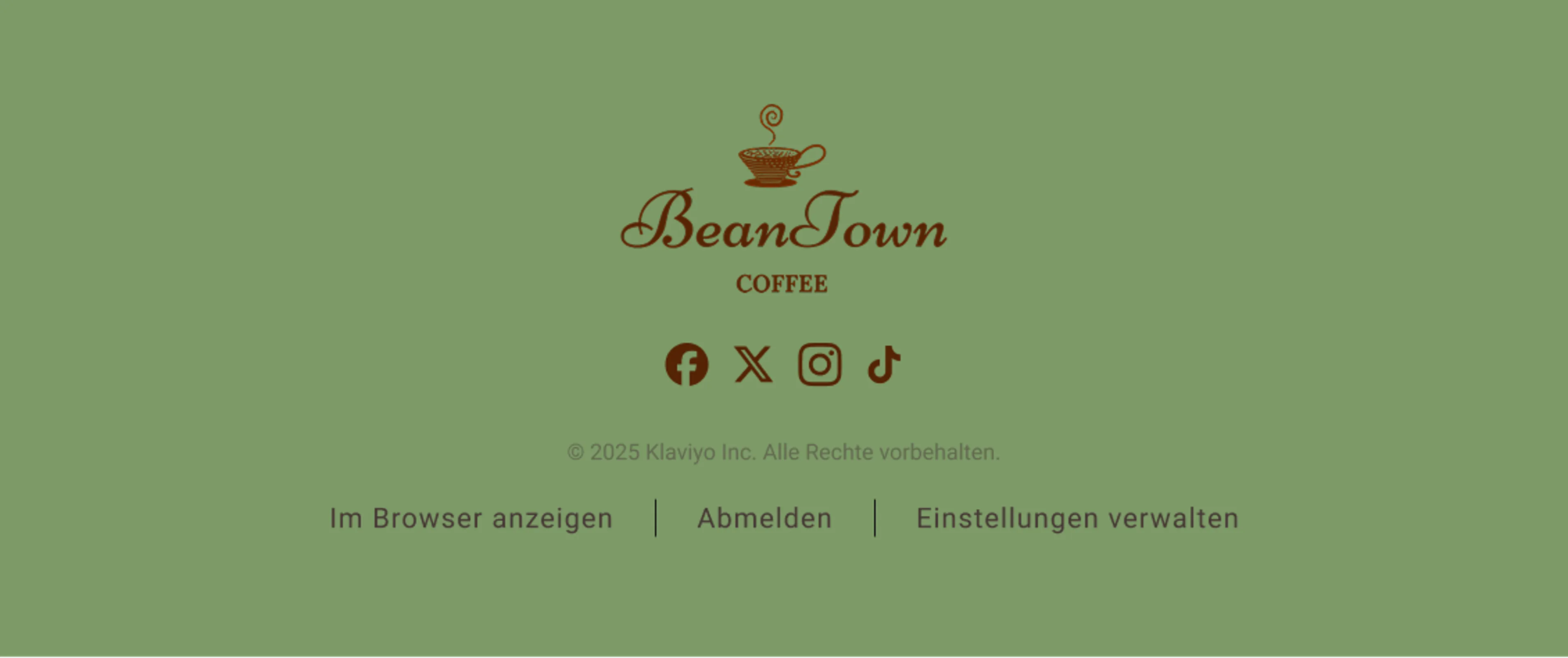 Das sollte enthalten sein: Social-Media-Symbole, Abmeldelink mit Anweisungen, Kontaktdaten des Unternehmens und Standort.