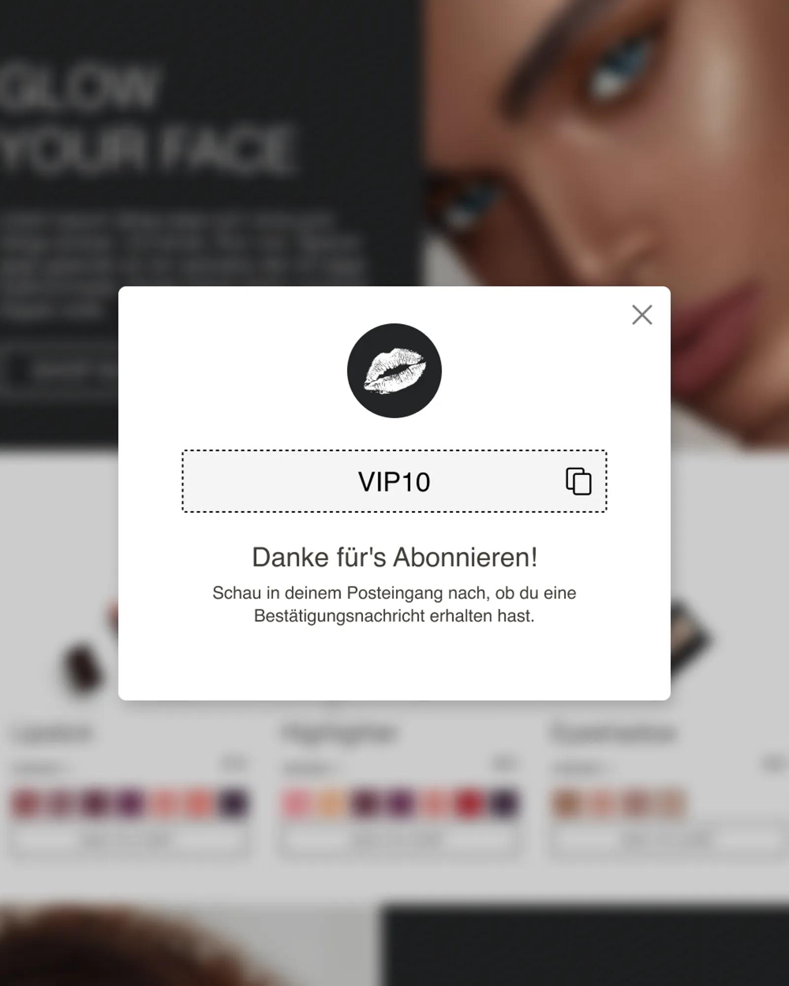 Bedenke dabei jedoch: Ein ganzseitiges Formular erregt zwar Aufmerksamkeit, kann aber das Einkaufserlebnis stören. Achte darauf, dass die Ankündigung klar und prägnant ist und einen unmittelbaren Nutzen bietet. Verwende aussagekräftige Bilder und klare Botschaften, um den Nutzen schnell zu vermitteln. Biete den Besucher*innen eine einfache Möglichkeit, das Formular zu schließen, damit sie bei Bedarf auch ohne Interaktion deine Website erkunden können.