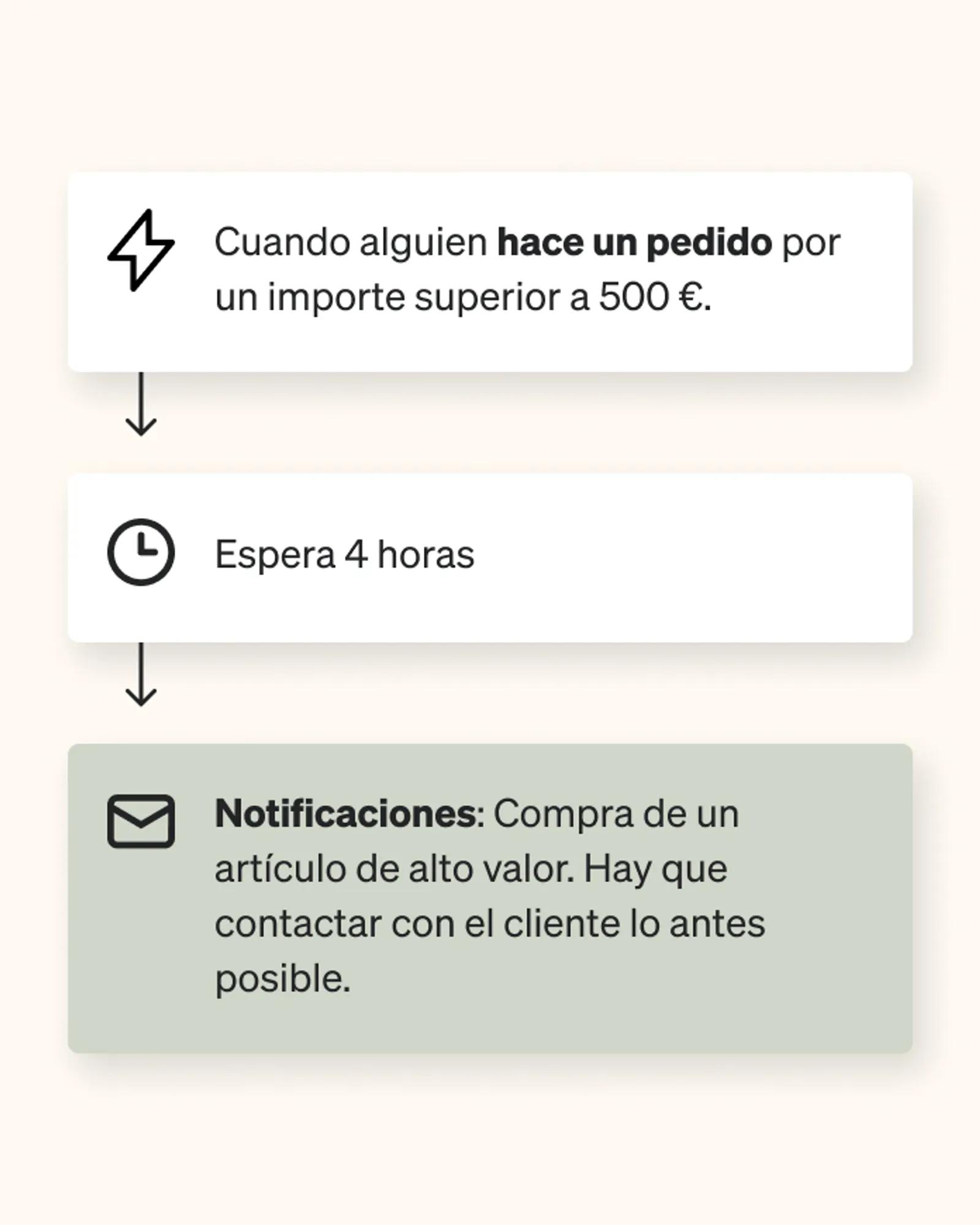 Imagina que has publicado un nuevo artículo de alto valor en tu catálogo. Es posible que quieras ofrecer asistencia adicional a quienes lo compren y, por lo tanto, avisar de ello al equipo de asistencia, éxito o ventas. Arrastra una acción de notificación al flujo para avisar a los miembros del equipo, que podrán ponerse en contacto personalmente con esos clientes.