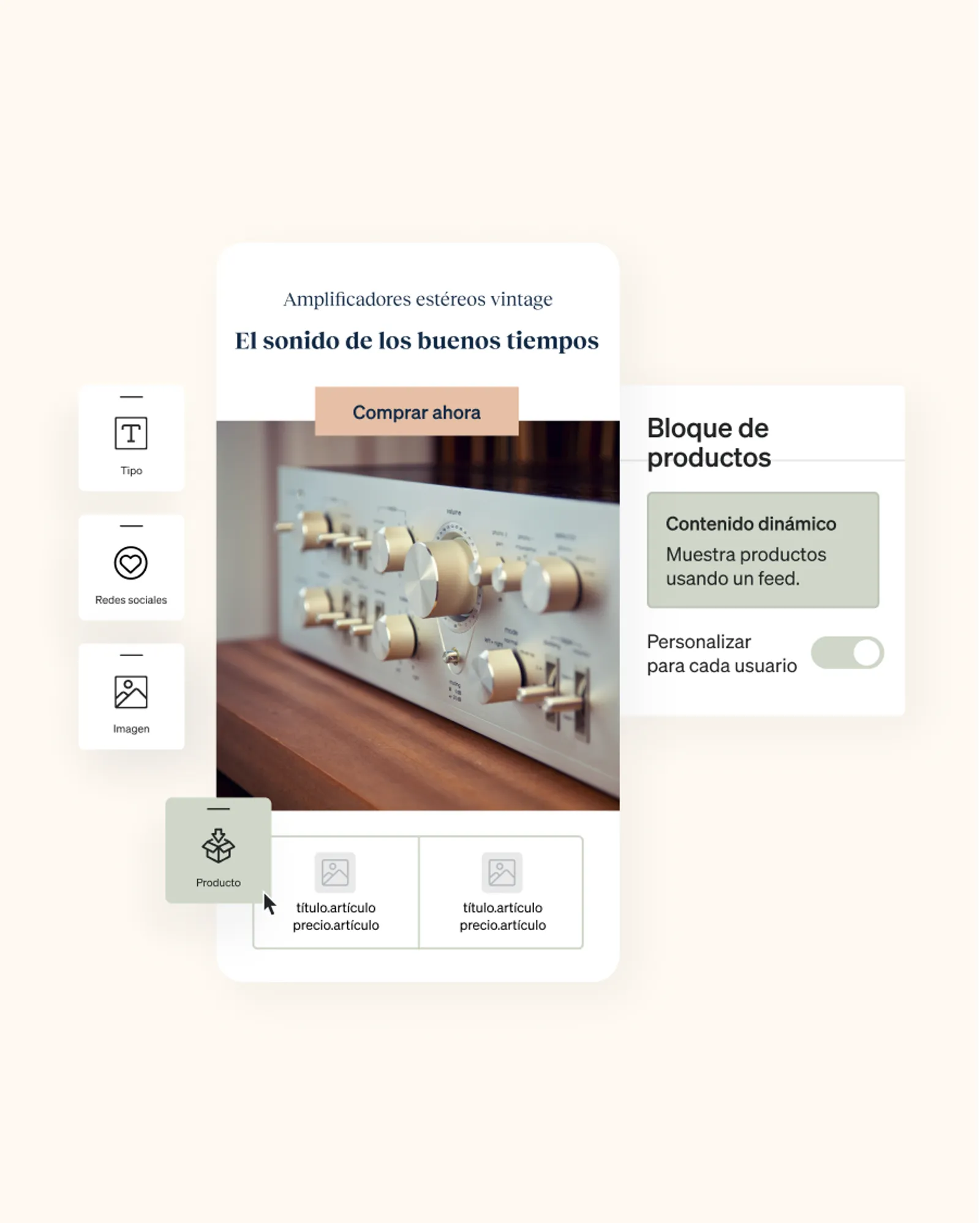 Incluye feeds de productos dinámicos que usen datos de tu catálogo de productos o del comportamiento reciente de los clientes (por ejemplo, los productos que han visto o comprado) para ofrecer recomendaciones en los emails. Se trata de una función muy útil que puedes incluir en los mensajes de flujo para impulsar las compras, tal como se muestra en este ejemplo.