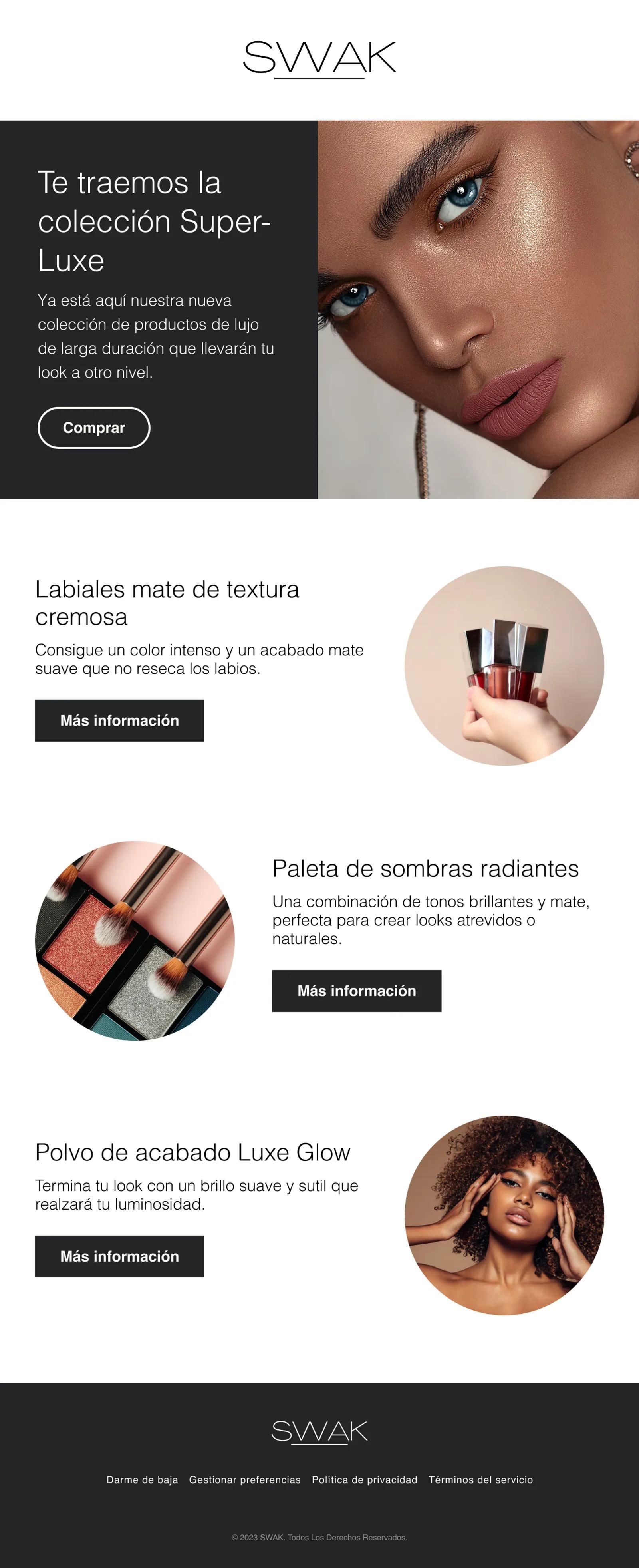 Si las existencias se agotan rápidamente, puede que te convenga implementar una estrategia de preventa y diseñar una campaña de preventa con su propia plantilla. Después, cuando llegue el momento del lanzamiento, necesitarás un formato llamativo que despierte el interés de los clientes. El diseño también puede variar en función de si estás promocionando una colección completa o un solo producto.