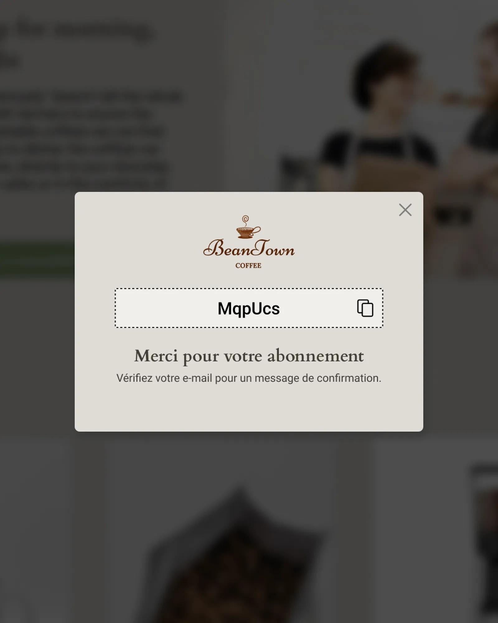 Remerciez un client qui interagit avec un formulaire sans l’obliger à quitter le site pour consulter ses messages. Des codes de réduction uniques peuvent être placés dans le message de fin d’un formulaire d’inscription pour récompenser le client. Le bloc de code de réduction est doté d’une fonctionnalité de copie facile, qui permet aux utilisateurs de cliquer directement sur le code pour le copier dans le presse-papiers, puis de le coller dans le panier au moment du paiement.
