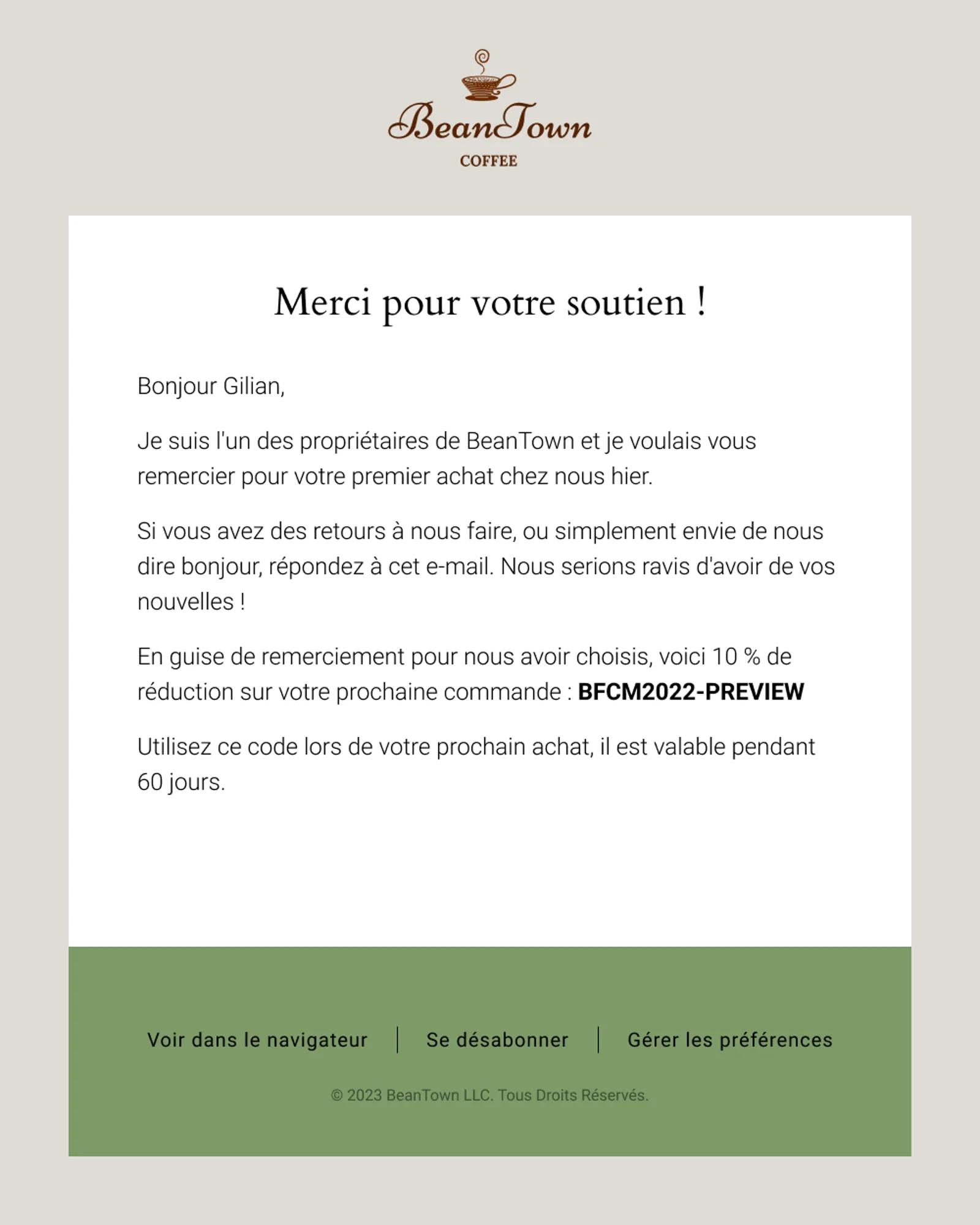 Ajoutez un code de réduction unique à un flux, comme la série de bienvenue ou de panier abandonné, pour inciter à l’action. Notez que si vous n’utilisez pas Shopify, Magento (1 ou 2), WooCommerce ou PrestaShop , vous devrez télécharger plus de codes uniques de manière régulière. Comme les flux sont envoyés à chaque destinataire en fonction de certains critères, Klaviyo ne peut pas vérifier si suffisamment de codes sont disponibles.