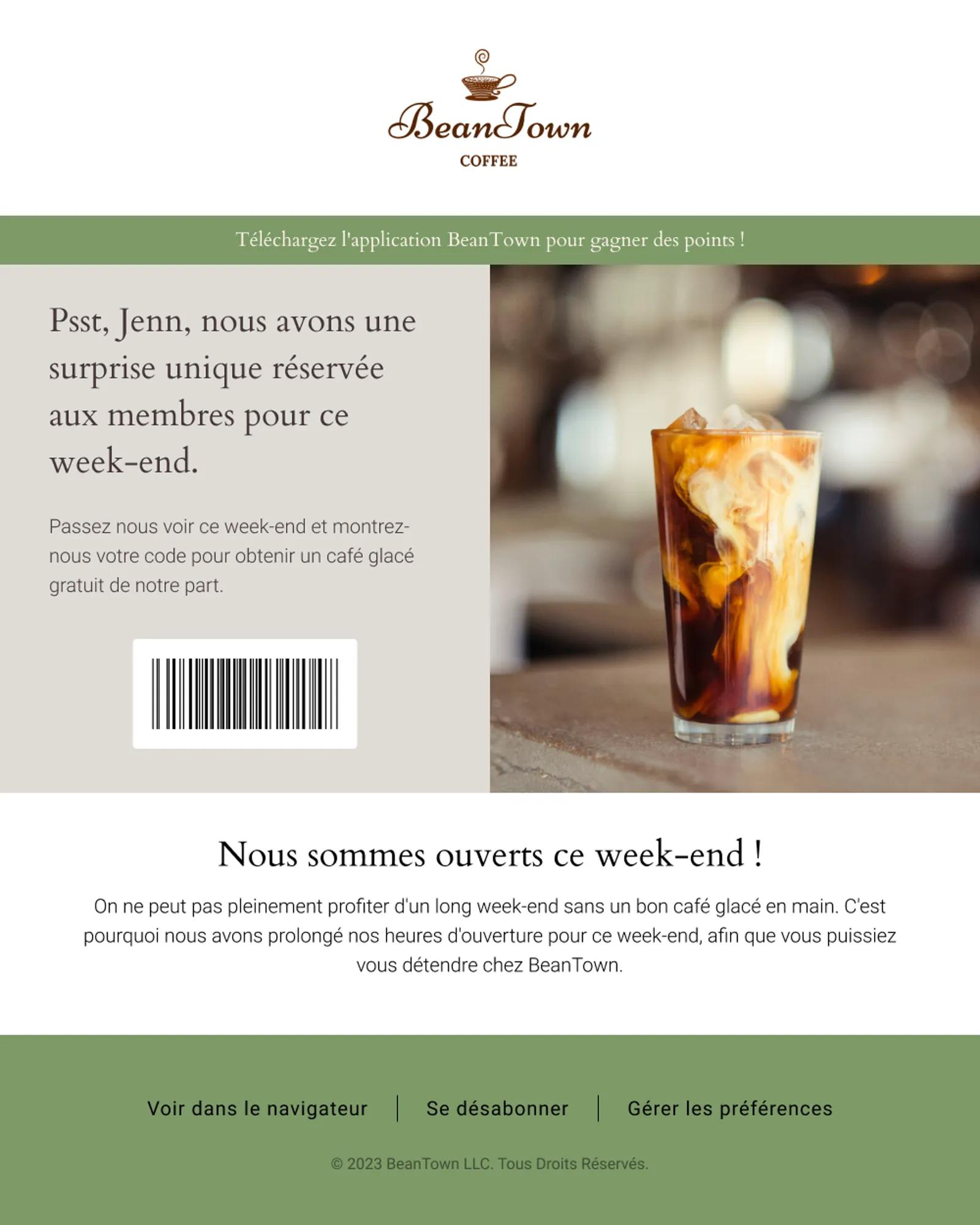 Si vous avez un point de vente physique, vous pouvez afficher vos codes de réduction sous la forme de codes-barres à scanner en magasin. Klaviyo permet d’afficher les codes dynamiques sous la forme de codes-barres dans les e-mails en incluant la balise de modèle suivante : {% barcode_code 'CouponName' height=100 width=200 %}