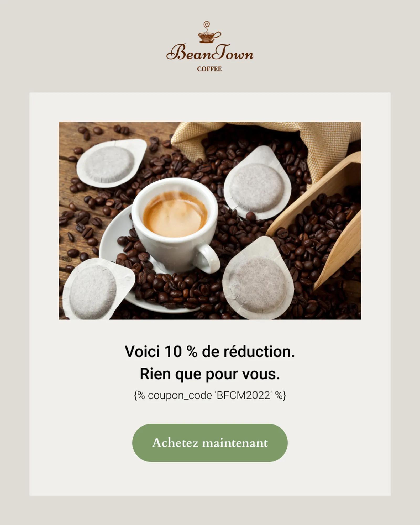 Remplacez CouponName par le nom du code de réduction souhaité sur Klaviyo. Cela permettra d’ajouter le code souhaité à votre texte. Voyons quelques exemples qui conviennent à l’utilisation d’un code de réduction unique.