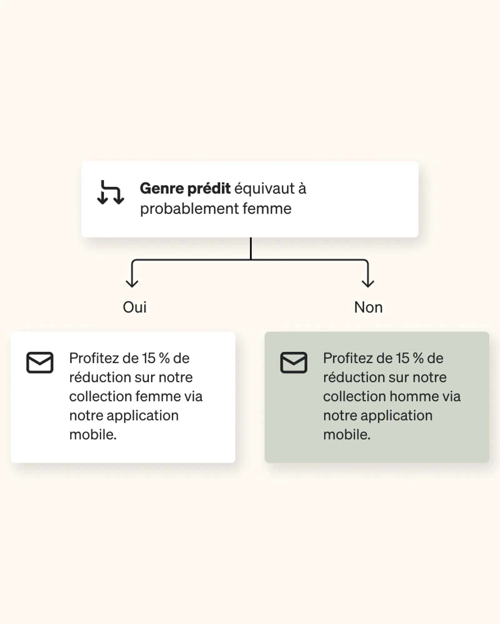 Le marketing omnicanal intègre tous les canaux sur lesquels votre marque est présente (par exemple, les e-mails, les SMS et les notifications push) pour générer du chiffre d’affaires. Un bon moyen de créer cette expérience consiste à diviser vos flux en différents parcours pour cibler les clients sur les canaux auxquels ils sont abonnés ou qu’ils préfèrent.