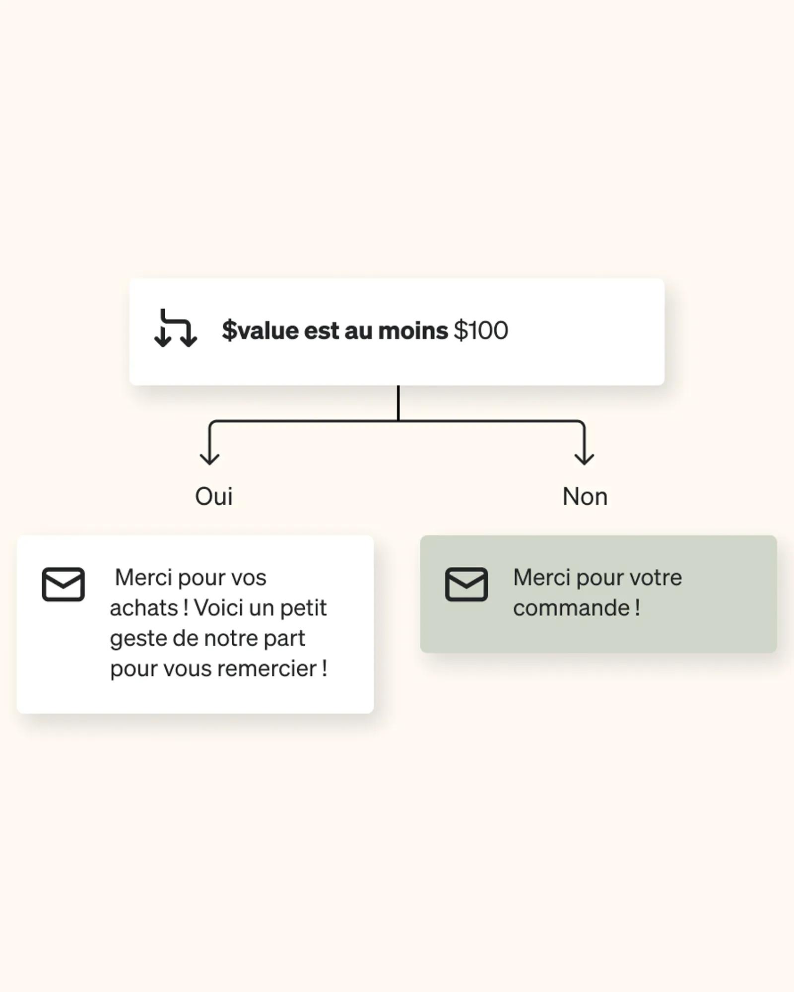 Ajoutez un fractionnement avec déclencheur à un flux basé sur un indicateur ou une baisse de prix pour créer différents parcours en fonction de la valeur de la commande, des remises appliquées, du nombre d’articles achetés, etc.