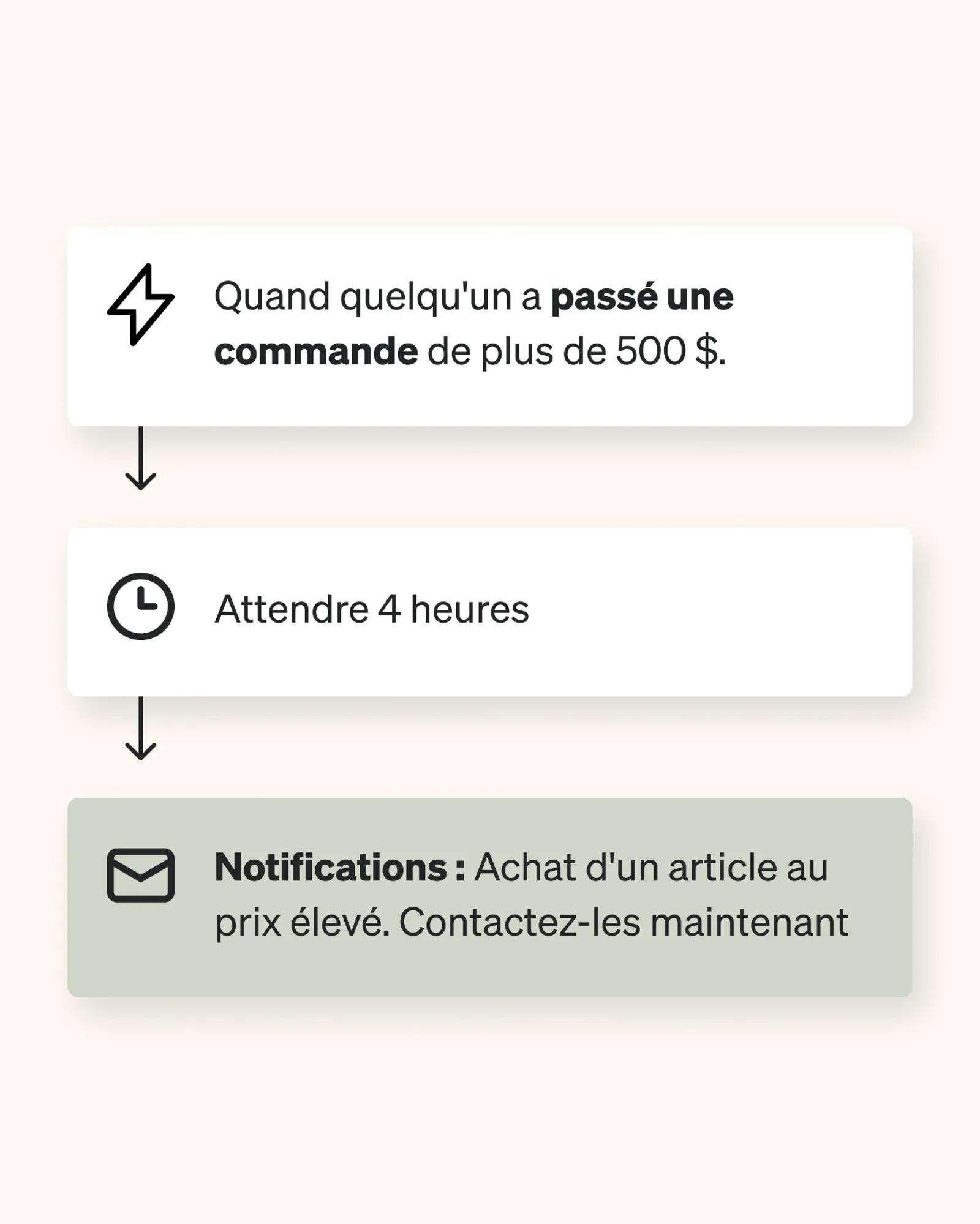Supposons que vous venez de lancer un nouvel article, dont le prix est particulièrement élevé. Vous pouvez proposer une assistance dédiée pour les personnes qui achètent et pour cela, vous devez faire en sorte que l’équipe d’assistance ou le service commercial soit alerté lorsqu’un tel événement se produit. Faites glisser une action de notification dans votre flux pour avertir les membres de l’équipe, qui pourront alors contacter personnellement le client en question.
