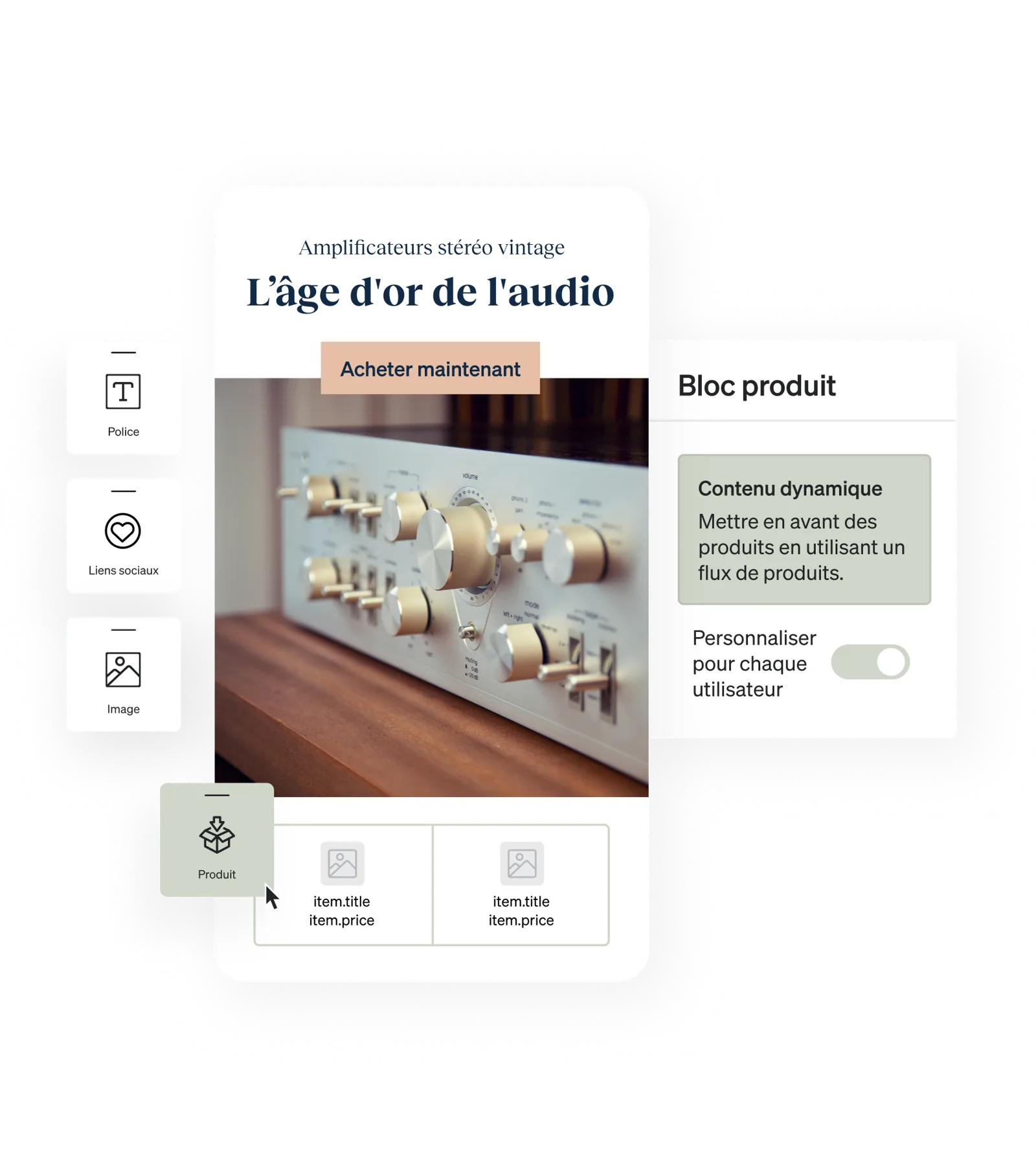 Proposez des flux de produits dynamiques qui exploitent les données de votre catalogue ou le comportement récent des clients (par exemple, les produits qu’ils ont consultés ou achetés) pour inclure des recommandations dans vos e-mails. Il s’agit d’une fonctionnalité intéressante pour les messages de flux qui incitent à acheter, comme le montre cet exemple.