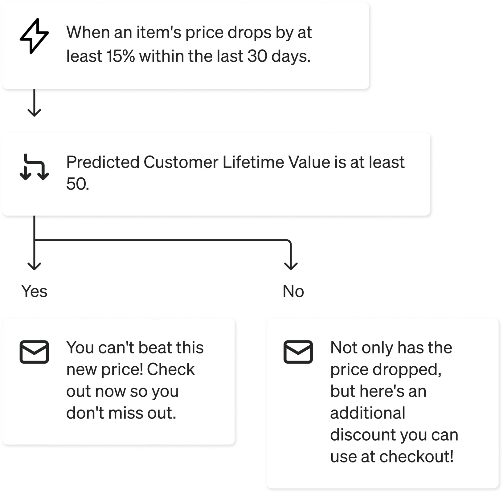 Personalization is key to these messages; use profile properties to cater your flow messages to each individual. You may also consider adding conditional splits based on customer lifetime value (CLV), and providing an additional incentive to customers unlikely to convert without a discount.