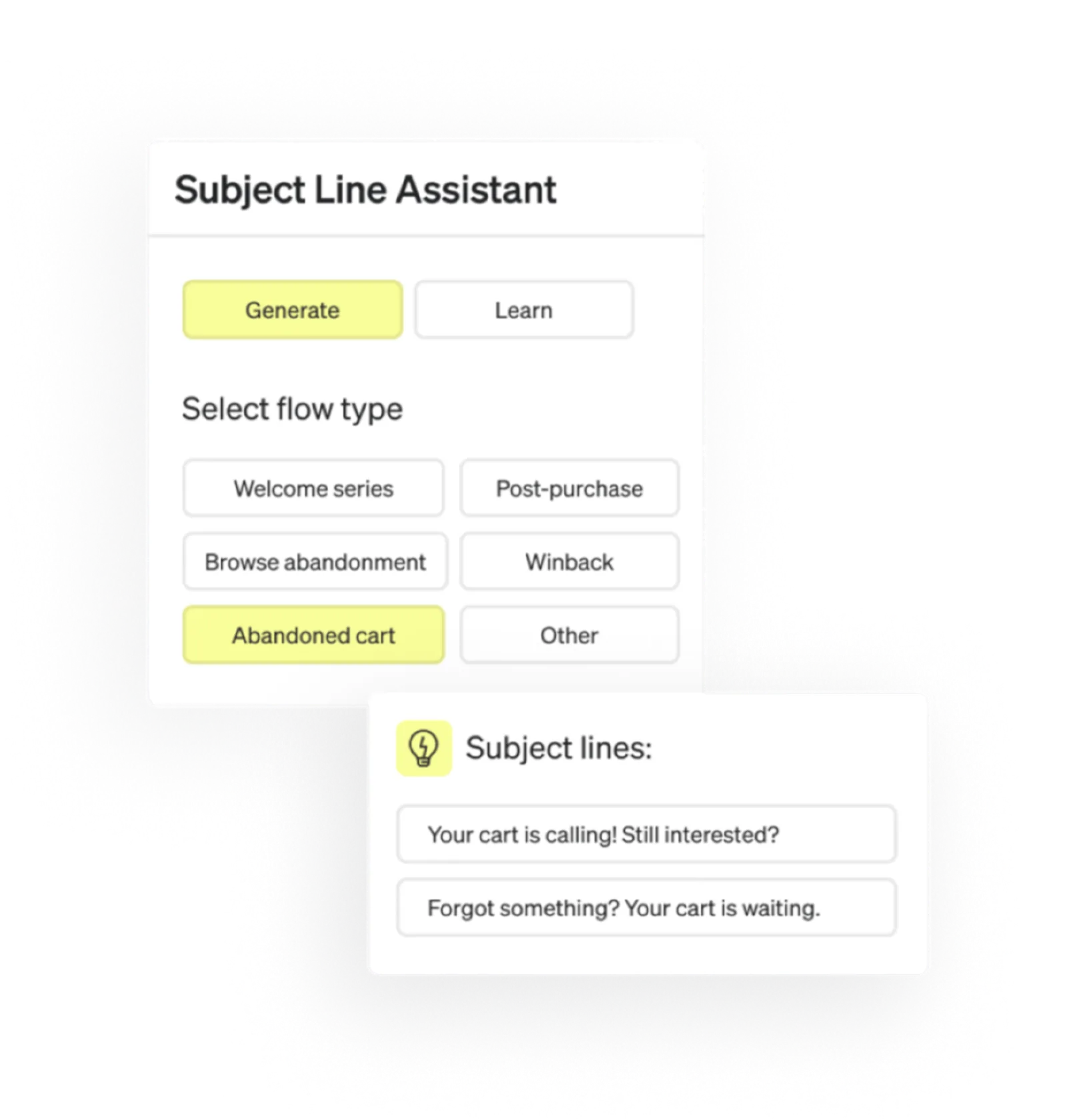 Boost inbox appeal with Klaviyo’s subject line assistant. Choose an auto-generated subject line customized to your brand and goals. Use as is or edit to fit your needs. Learn more about the subject line assistant.