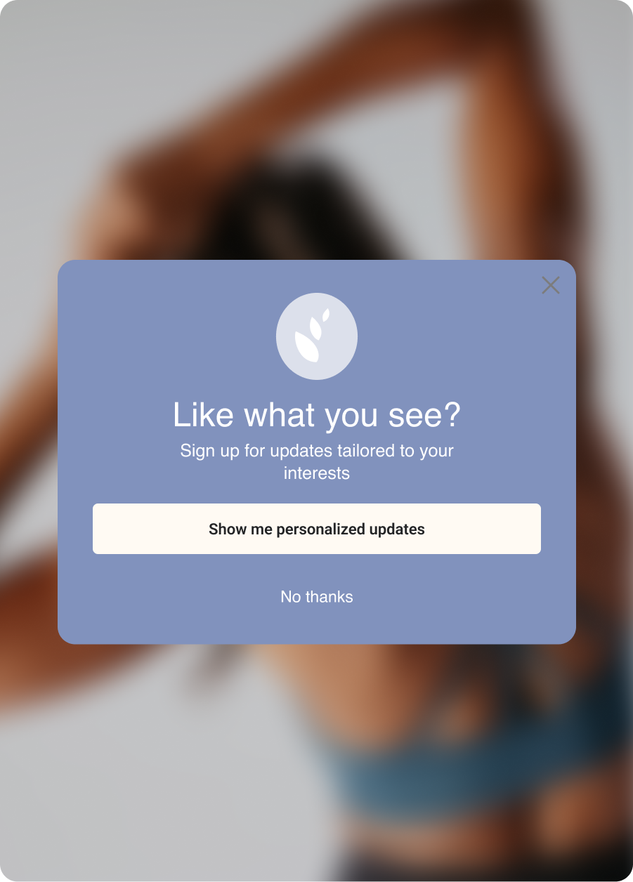 • Adjust form content and value exchange based on lifecycle stage and onsite behavior (how recently they subscribed to another channel, how often they shop, their loyalty tier, etc.).