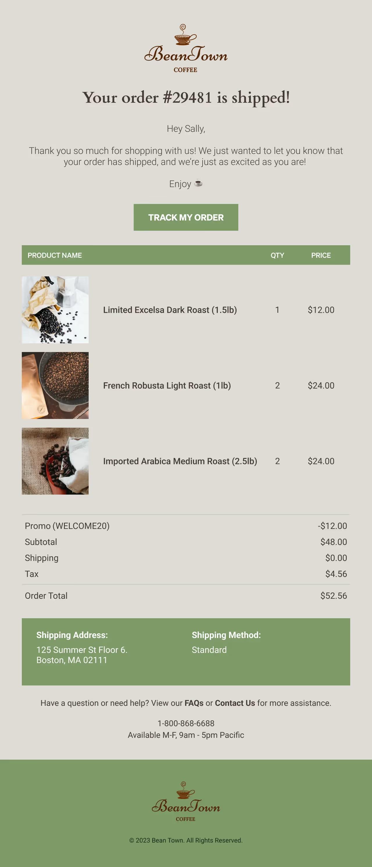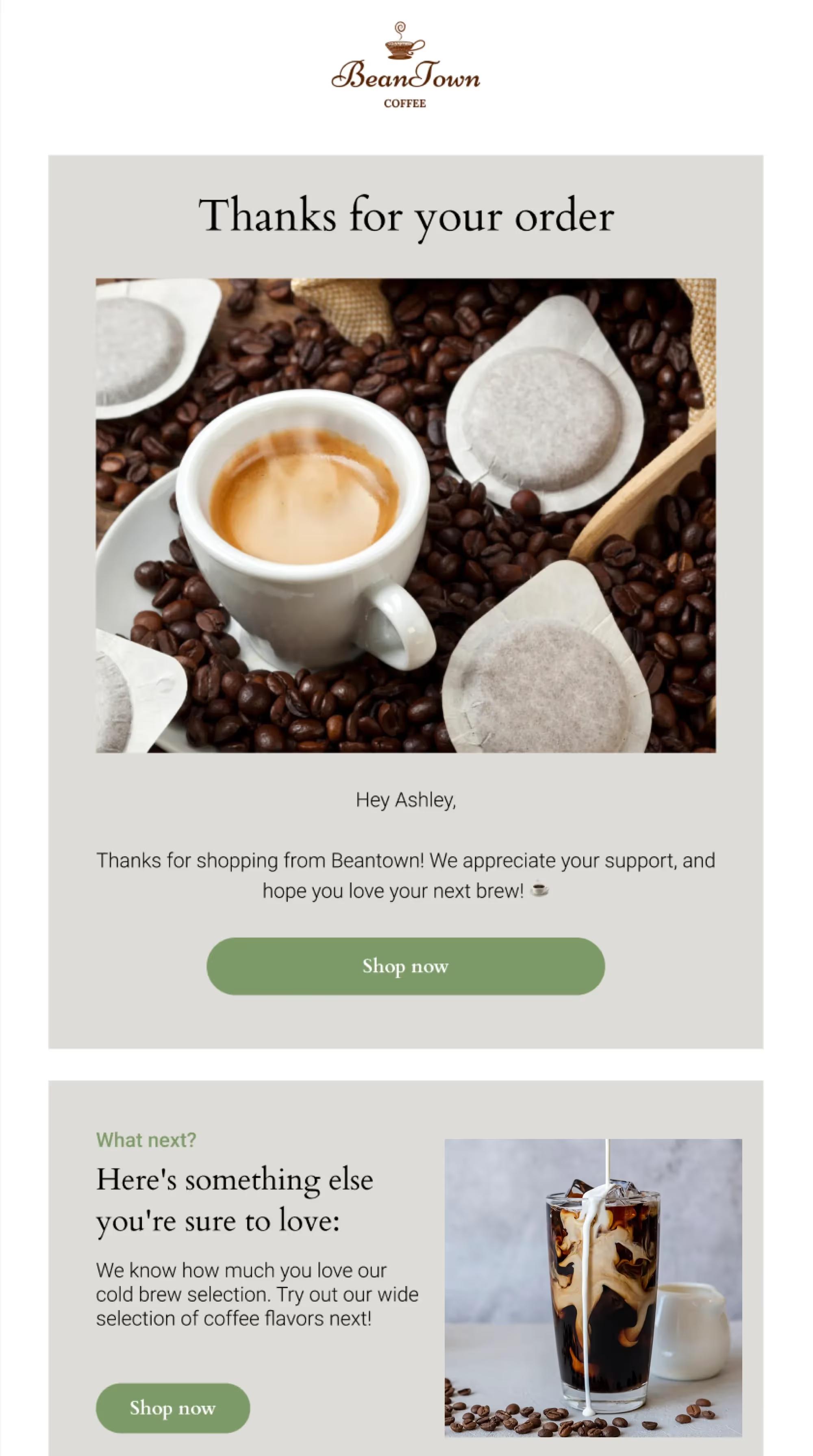 First and foremost, show customers that you care and appreciate their purchase. Send a thank you message that feels genuine and specific to their purchase. You should likewise include key information that they may be expecting upon placing an order. For instance, add in their first name and include order details, like an image, price, quantity, and product name.