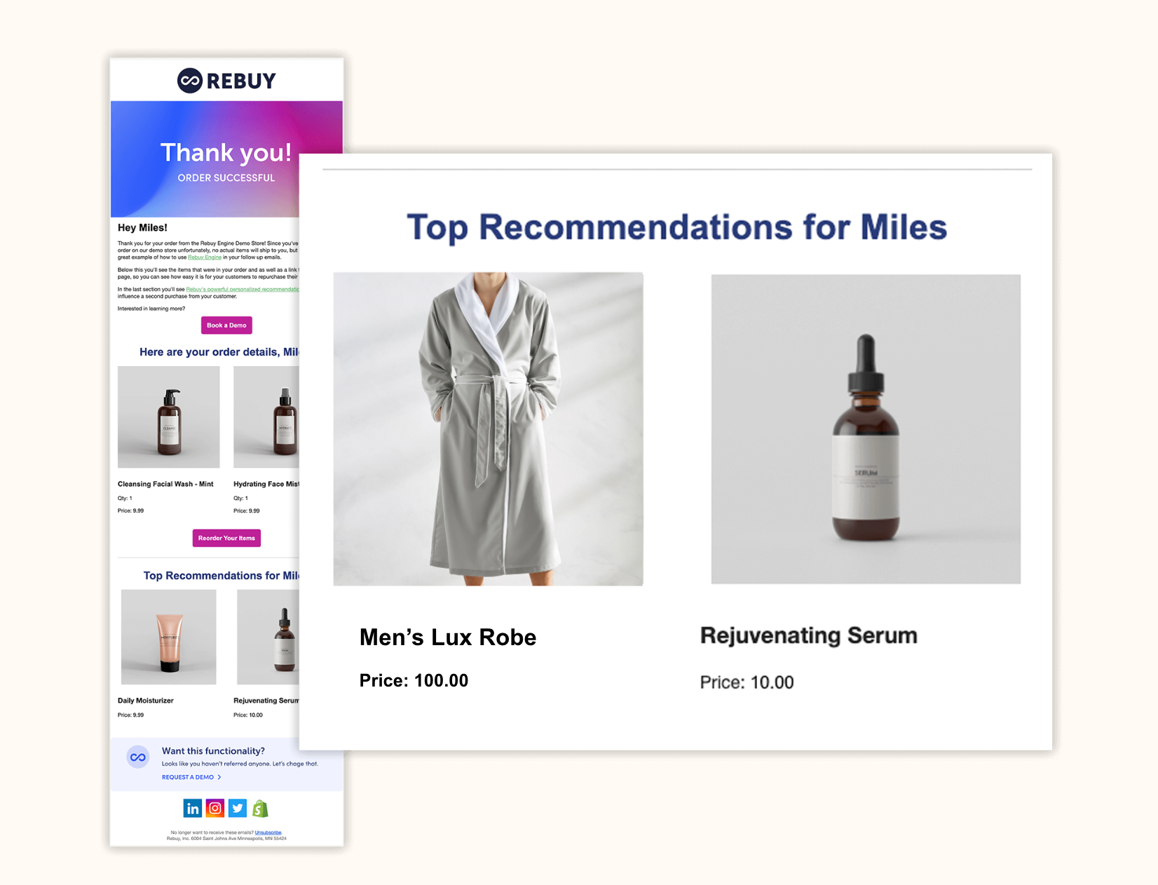 The following example shows an order confirmation email where a customer purchased face wash and moisturizer from a spa company. The company’s content personalization solution uses the transactional data to send a post-purchase email with personalized product recommendations that mirror the customer's shopping experience.