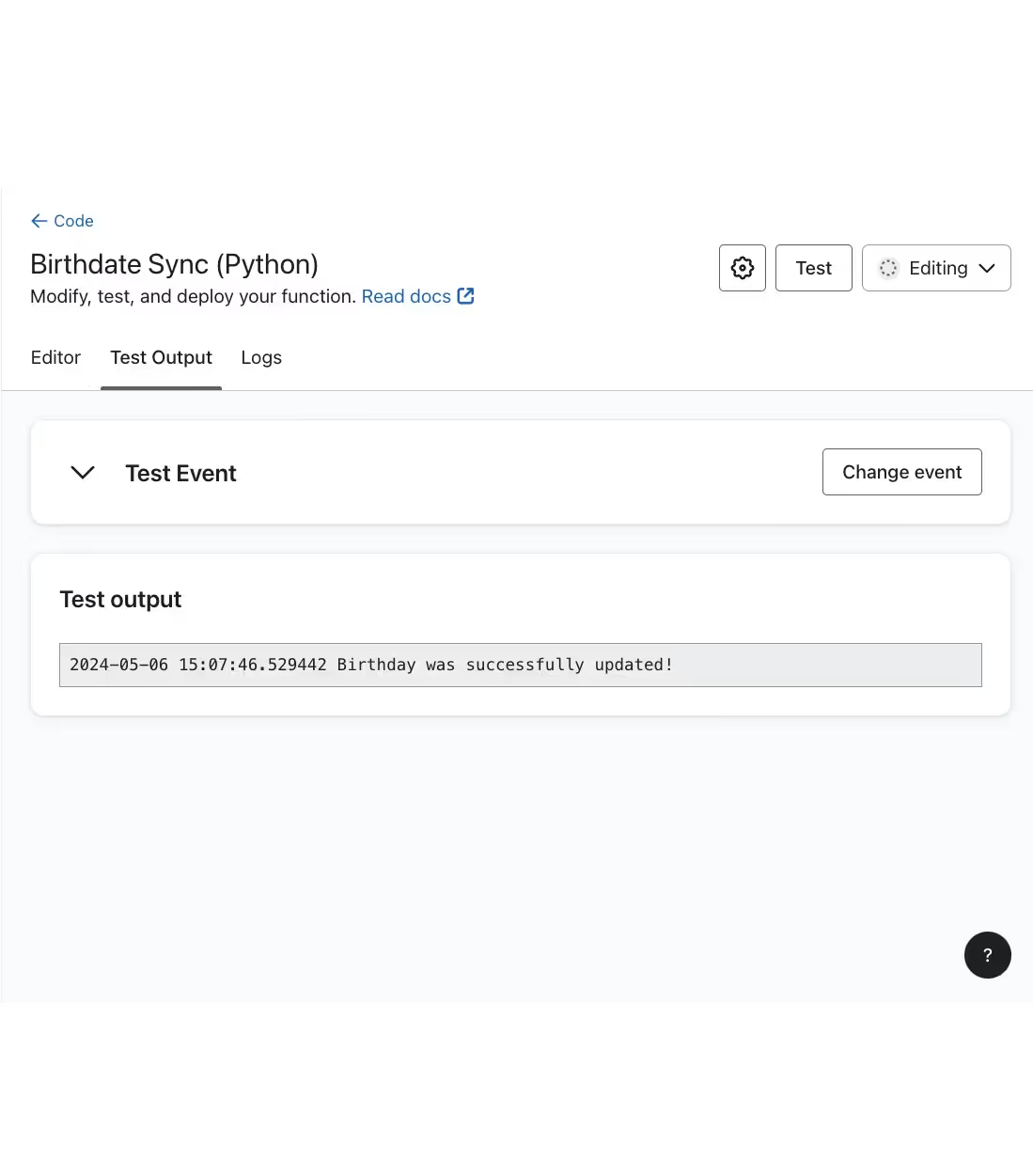 You can test your function from this tab by clickingRun test and selecting one of the 10 most recent events from the last 30 days to test with. If there have been no triggering events in the last 30 days, no events will be available for testing.