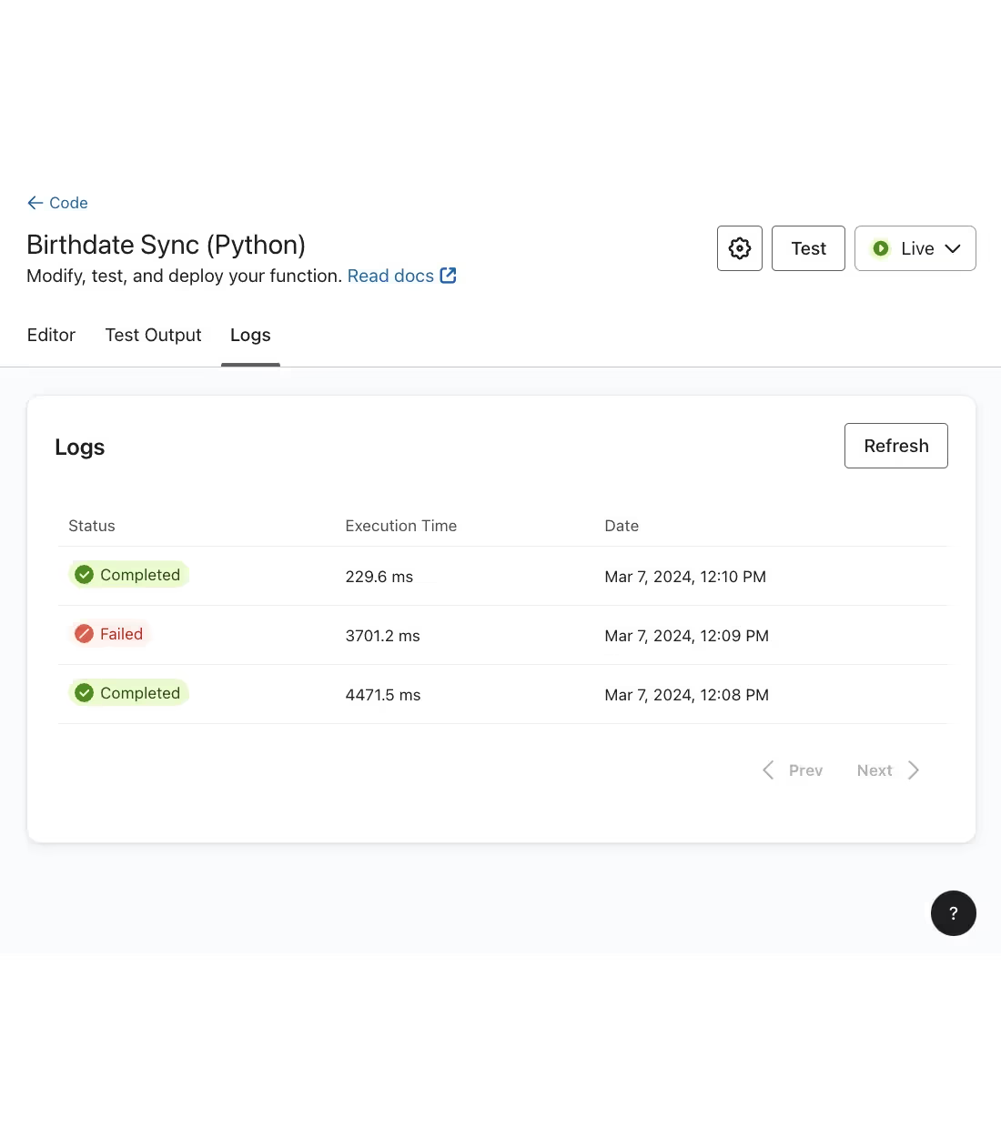 Once the function has been set live, the Logs tab will show all of the times the function has been triggered. The overview will show whether each invocation of the function was successful or unsuccessful.