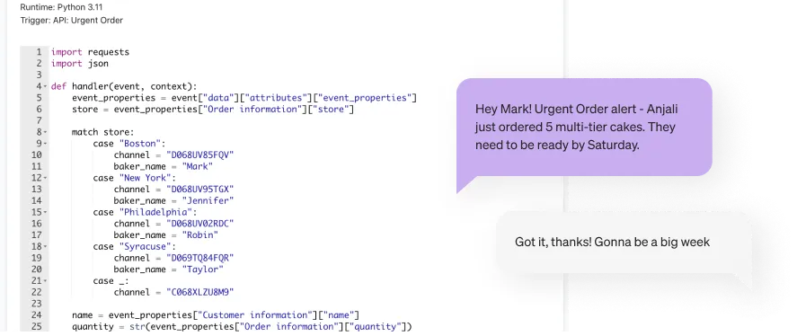 The Bola’s team is now able to write a function in Code triggered by the Placed Urgent Order event. This function sends a Slack message to the correct head baker based on location and informs them of the quantity and due date of each urgent order.