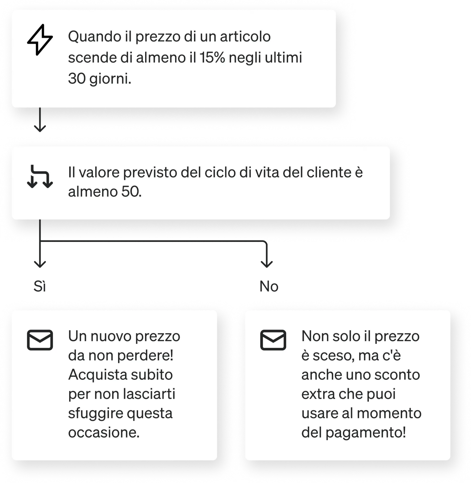 Ad esempio, un flusso per scorte ridotte spinge i clienti a comprare un articolo prima che finisca. Al contrario, un flusso per prodotti nuovamente disponibili ti permette di avvisare velocemente i clienti interessati riguardo al riassortimento di un articolo molto richiesto. Un flusso di calo dei prezzi segnala invece ai clienti quando il costo di un prodotto scende.