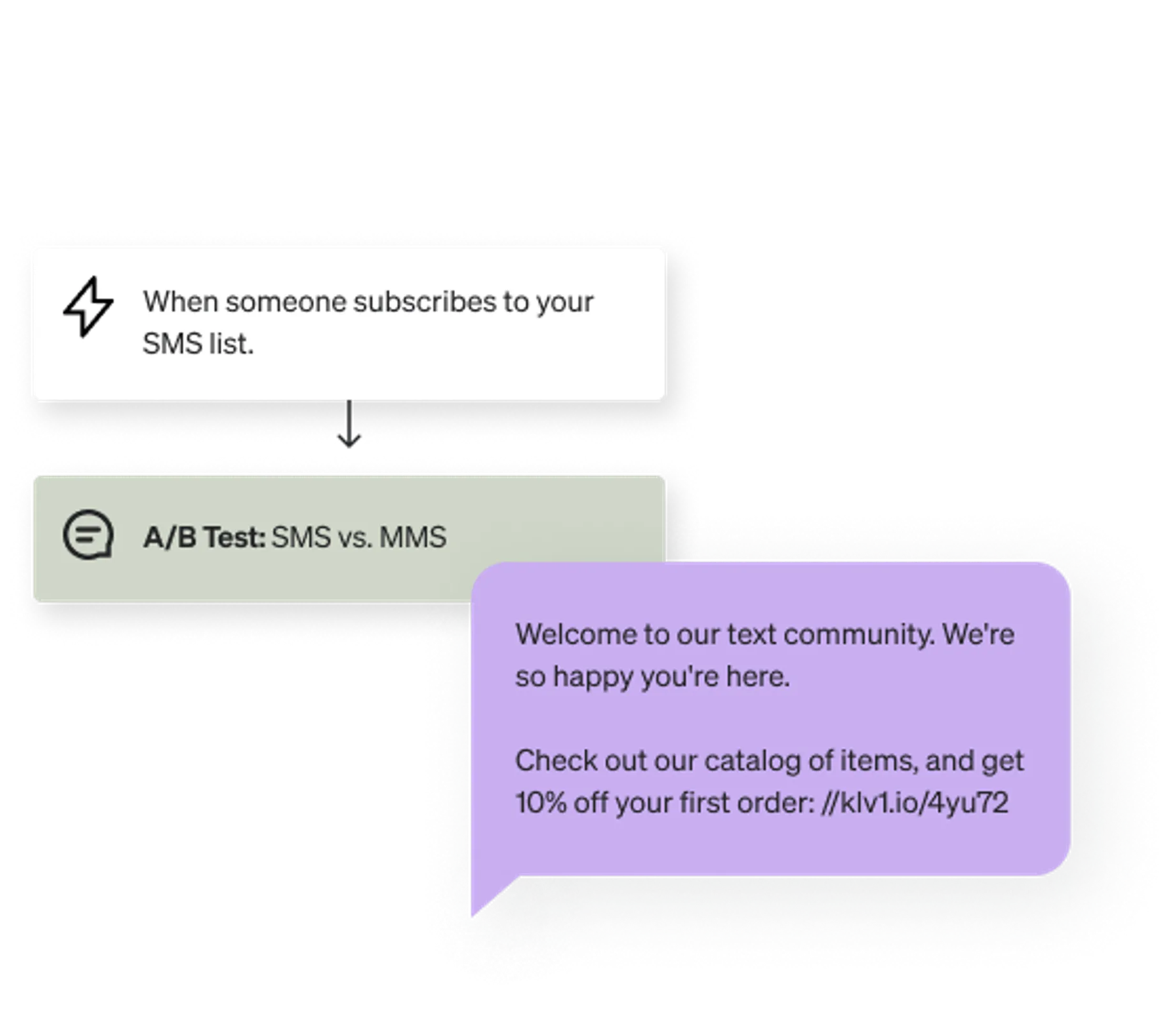 - A/B test: They create 2 variations of the first SMS message, adding an image to 1 variation and leaving the other as is.