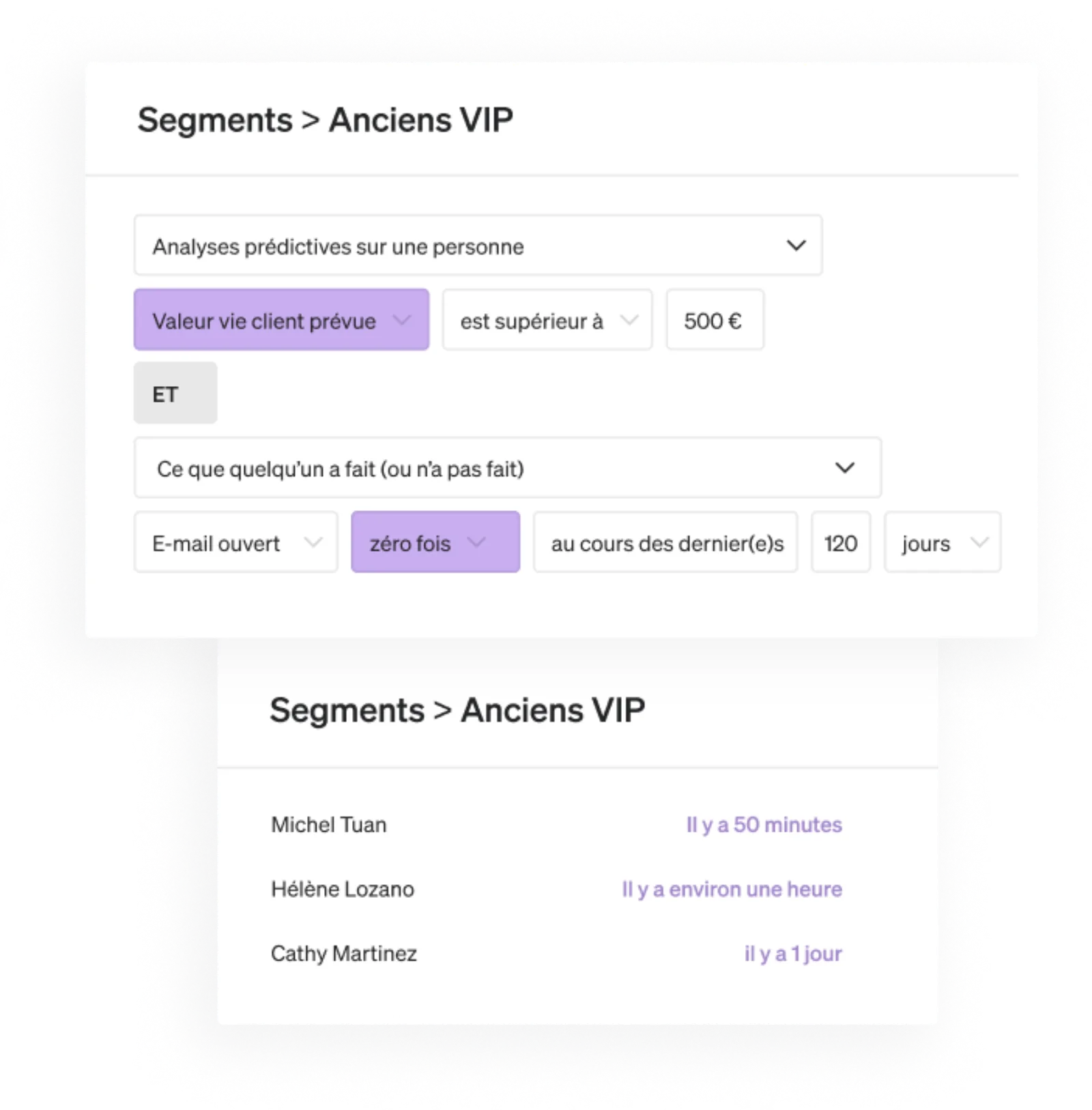 Les segments regroupent des personnes selon un ensemble de conditions (par exemple, leurs actions ou leurs propriétés). Contrairement à une liste, qui reste fixe, un segment s’agrandit au fur et à mesure que de nouvelles personnes remplissent les conditions que vous avez définies.
