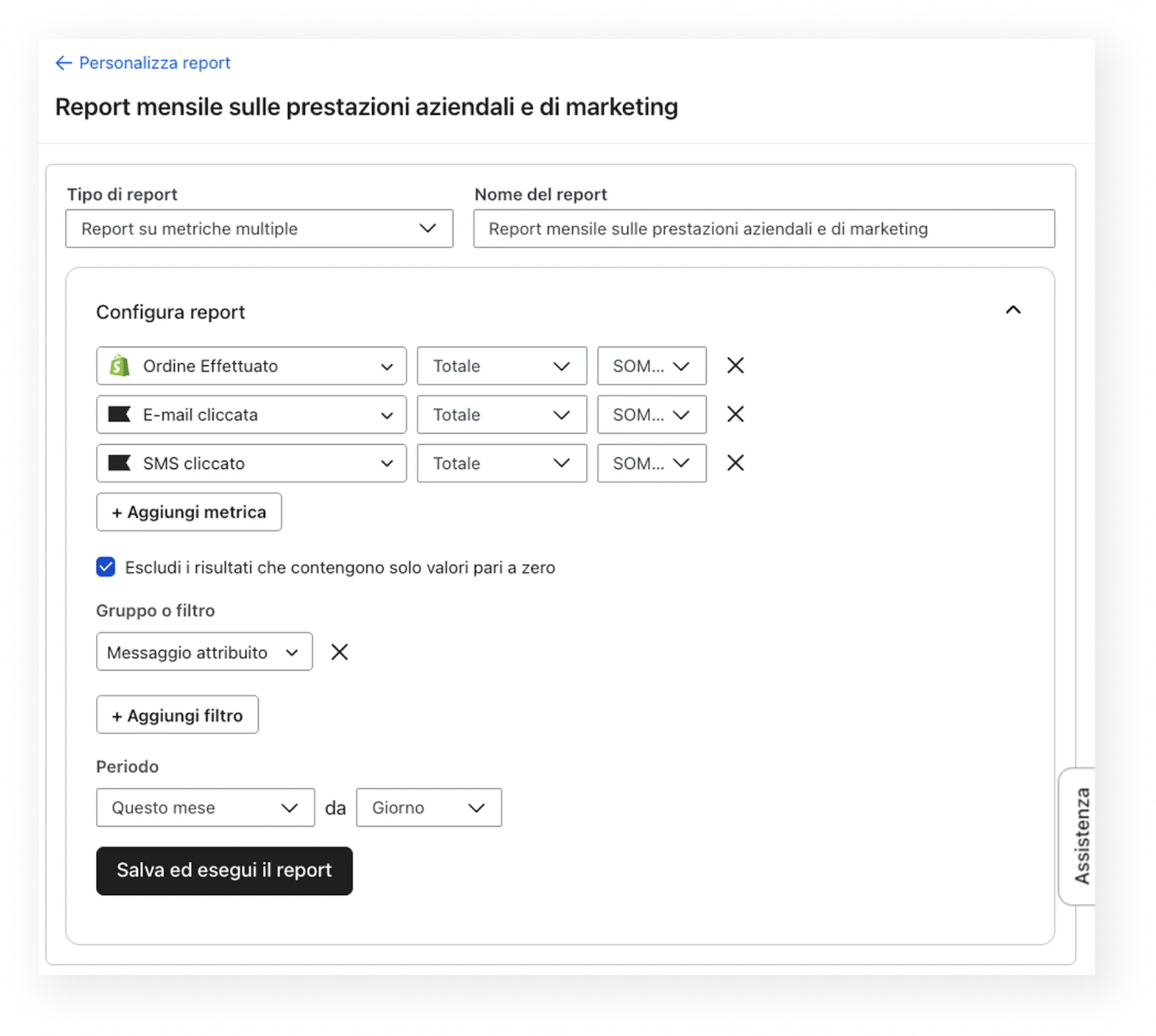 Esempio: crea un report personalizzato per monitorare gli ordini effettuati nel tuo negozio online e il coinvolgimento via e-mail e messaggi di testo in Klaviyo.