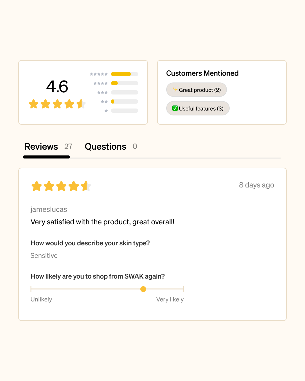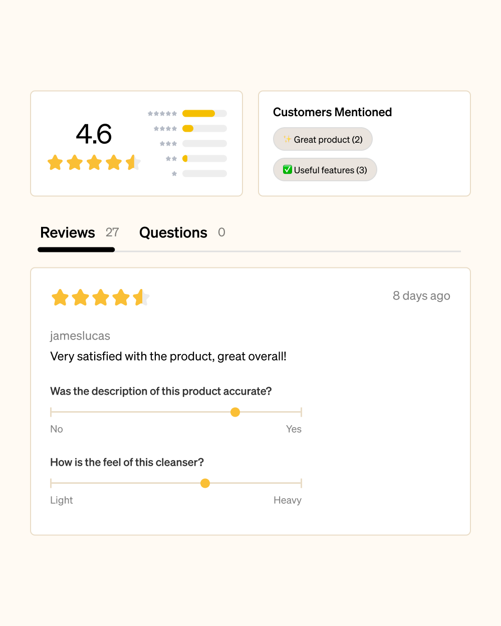 Custom questions directly pertain to your brand: they are drafted by you, personalized to align with the customer experience, and built to provide deeper insights into each review. If customers answer these questions, then future site visitors will also be able to filter reviews based on responses.