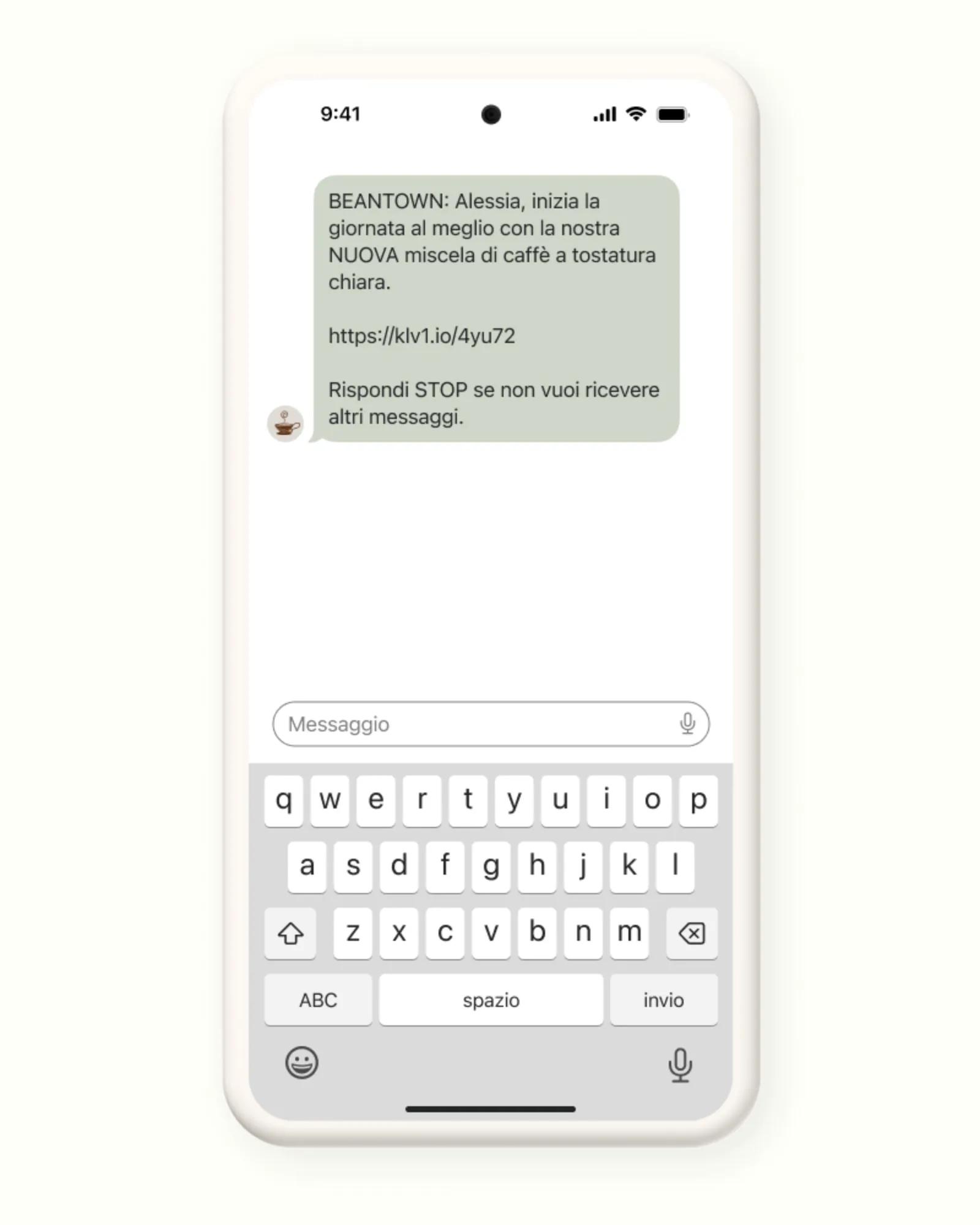 Beantown invia un messaggio di testo per promuovere un nuovo prodotto e invita gli iscritti a cliccare sul link che spiega come utilizzarlo al meglio. In questo modo, il brand condivide direttamente sul telefono degli iscritti informazioni utili per promuovere offerte esclusive, annunci aziendali o eventi.