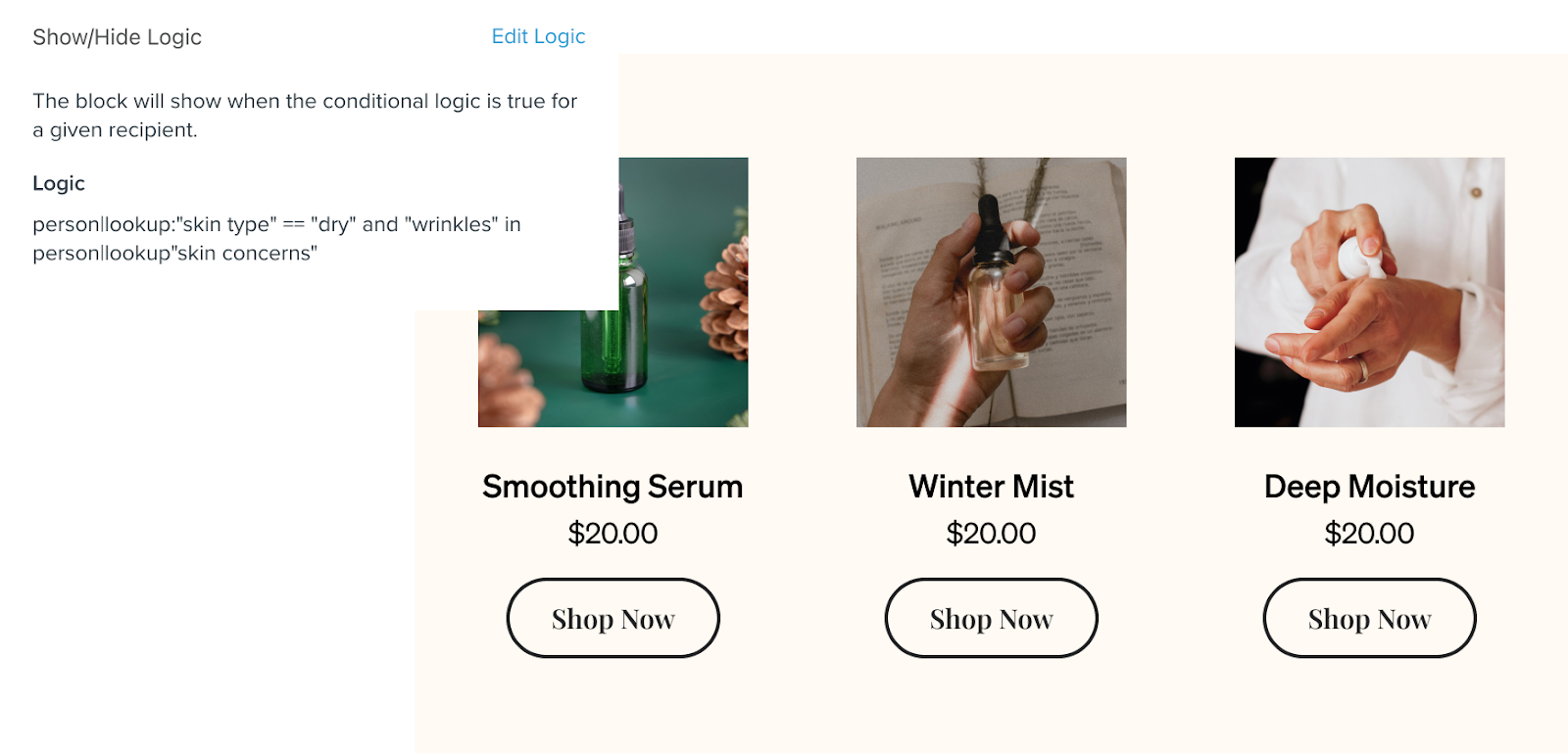Nani is going to include these customized product recommendations in a weekly Newsletter. They can use show/hide logic to only show product feeds appropriate for each customer based on their quiz answers.