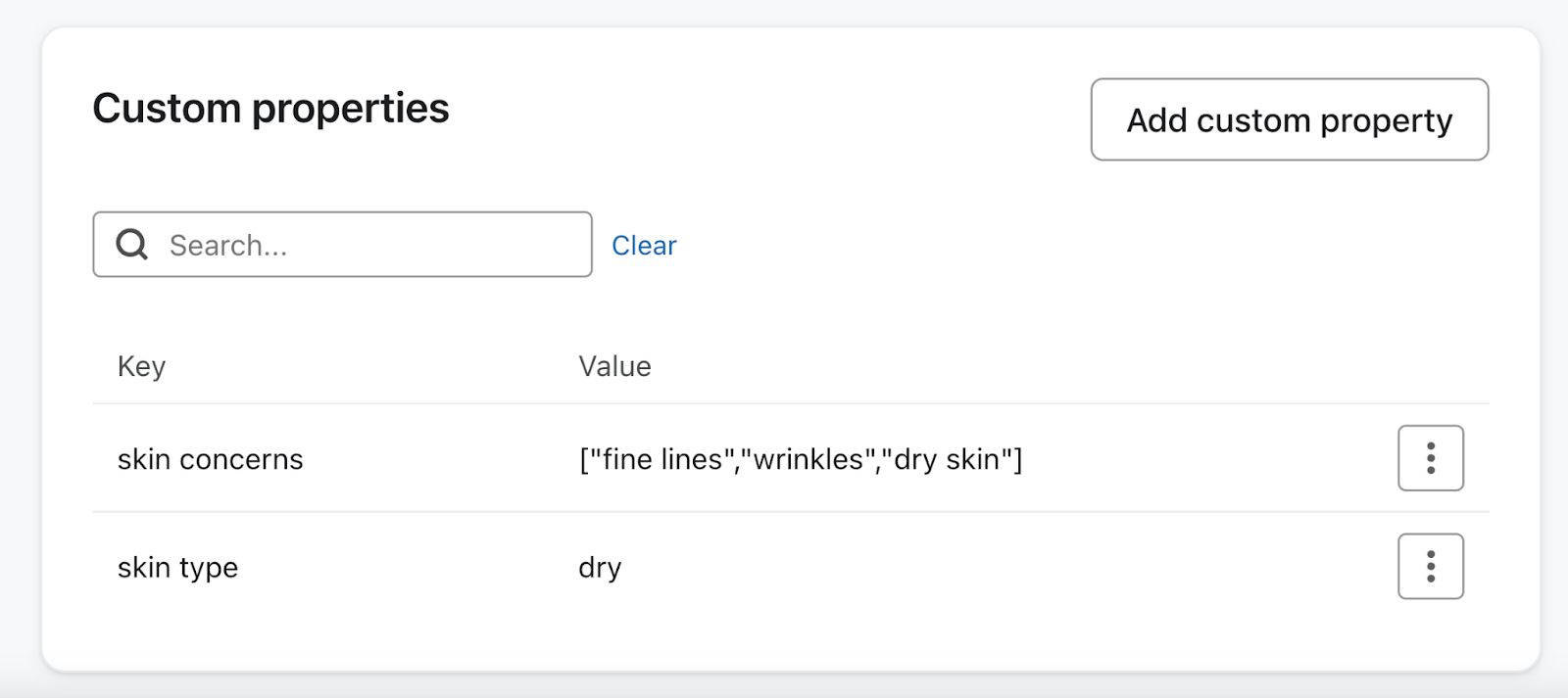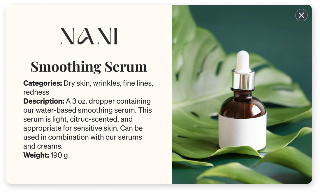 Nani's catalog is hosted on a custom back end. This custom back end contains detailed information about each product, including what skin types each product is best suited for.