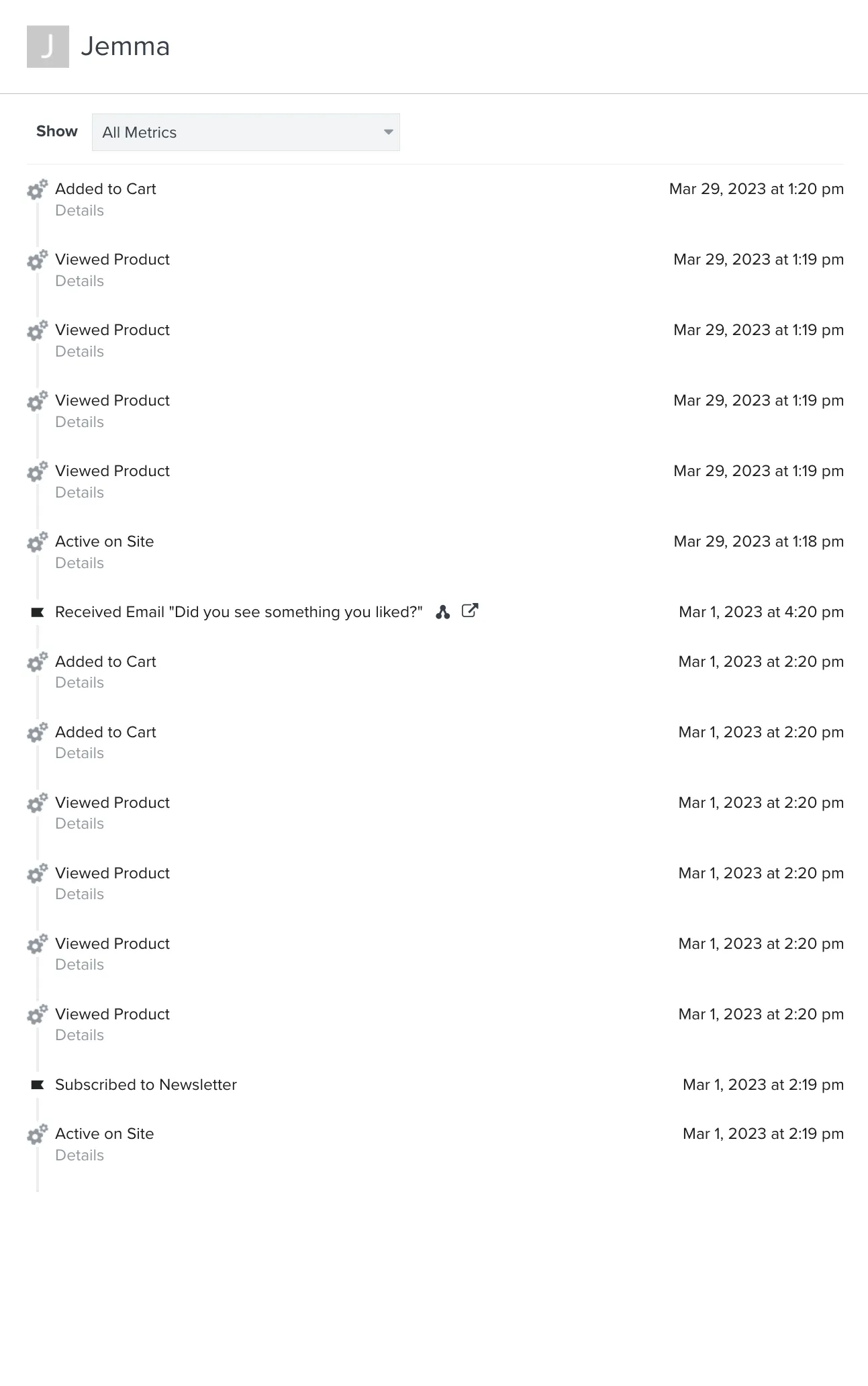 Events represent things that happen. These can be instigated by the customer, like Opened Email or Placed Order, or they can occur on the back end (e.g., Order Shipped).